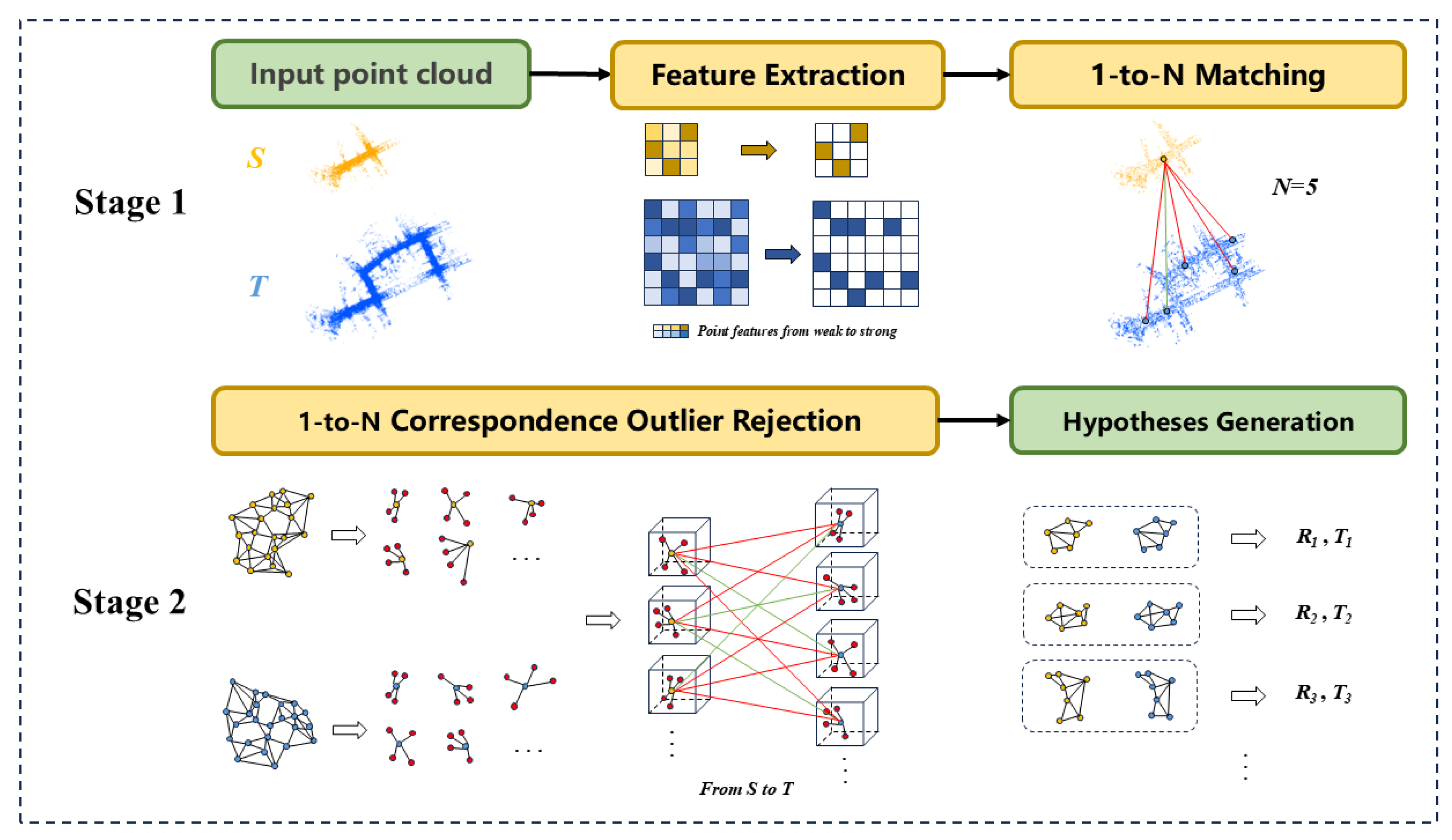 - Yang, J.; Chen, J.; Quan, S.; Wang, W.; Zhang, Y. Correspondence selection with loose–tight geometric voting for 3-D point cloud registration. IEEE Trans. Geosci. Remote. Sens. 2022, 60, 1–14. [Google Scholar] [CrossRef]