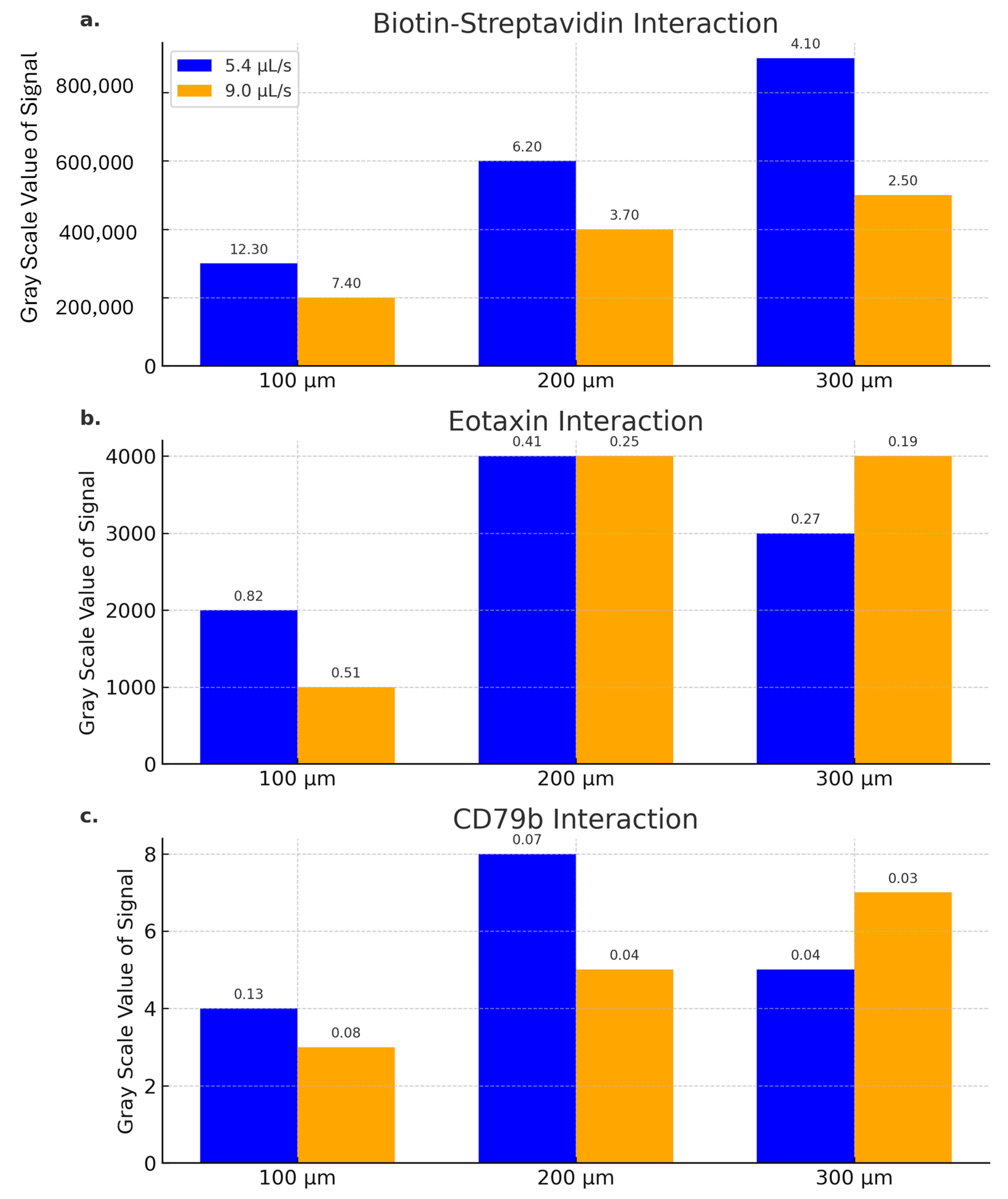 5.3. Speed of Reaction Kinetics of Various Analytes and the Height of Microfluidic Channel Influence on the Detection Signal Strength