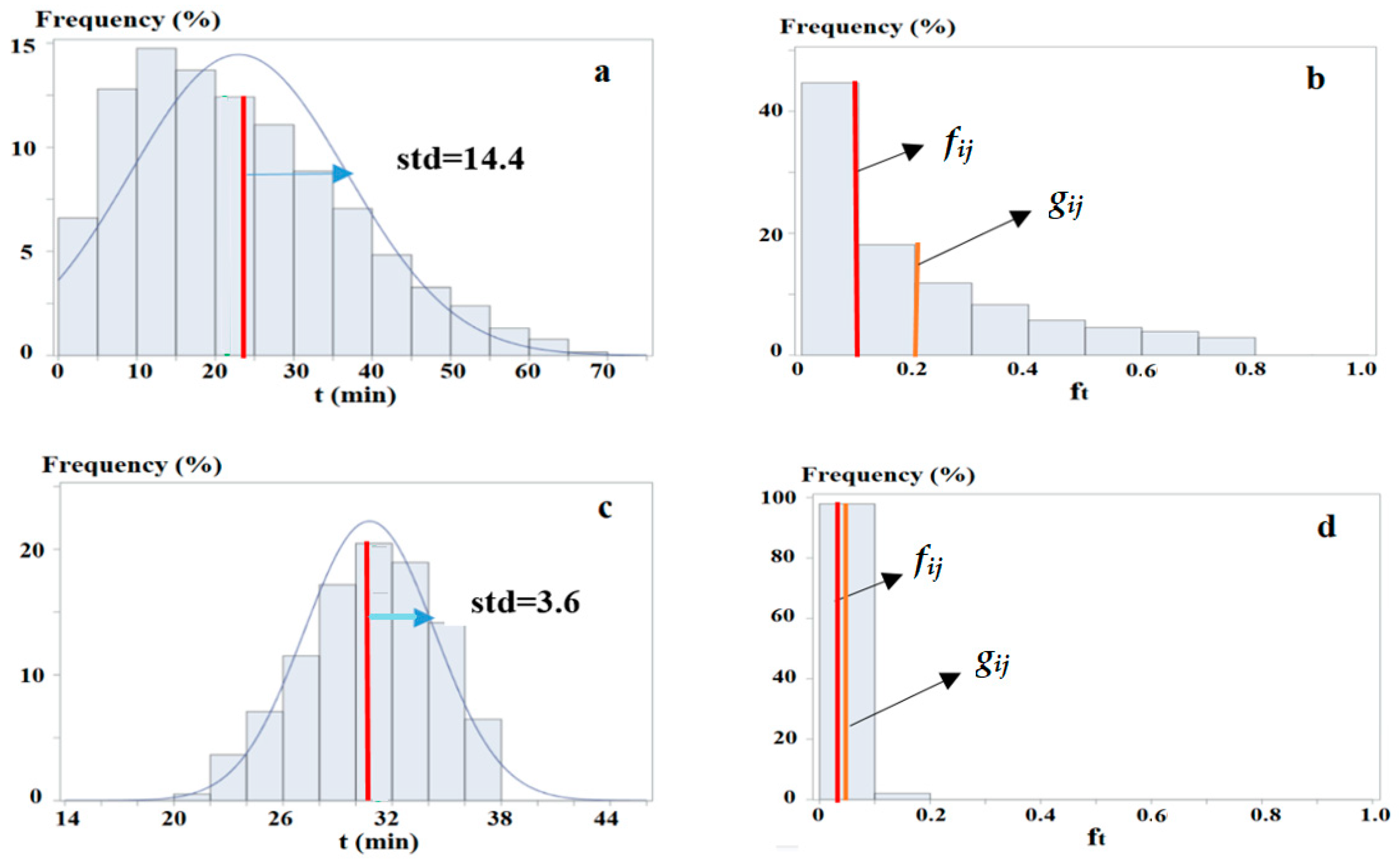 uij, stdij and skewij | The mean, standard deviation and skewness of travel time distributions for zij. |