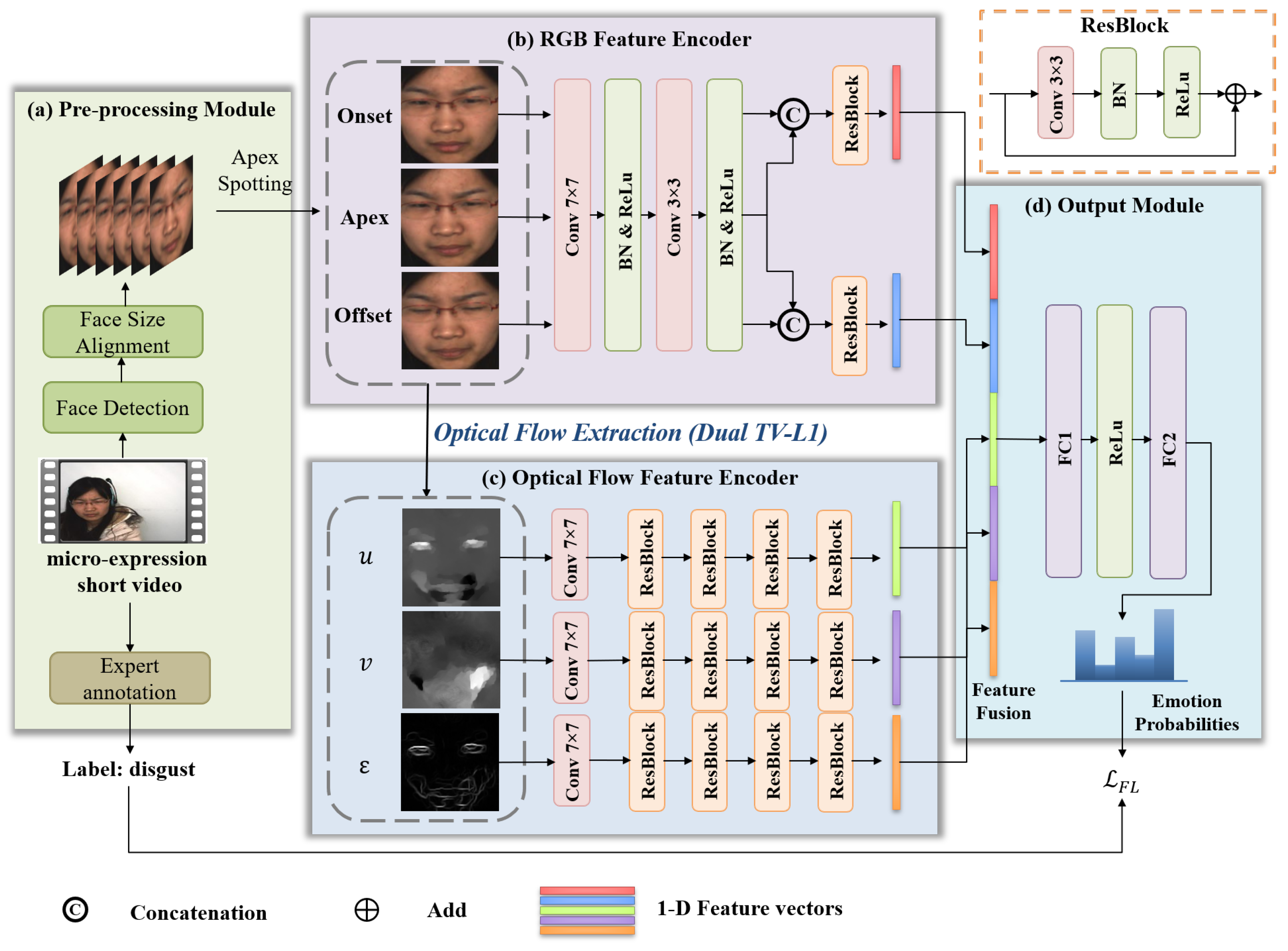 - Off-ApexNet [49]: A dual-stream CNN model that captures subtle facial motion by computing optical flow between the onset and apex frames. The network separately processes the horizontal and vertical components of flow to learn discriminative motion features. It is one of the earliest deep learning frameworks tailored for MER tasks.
