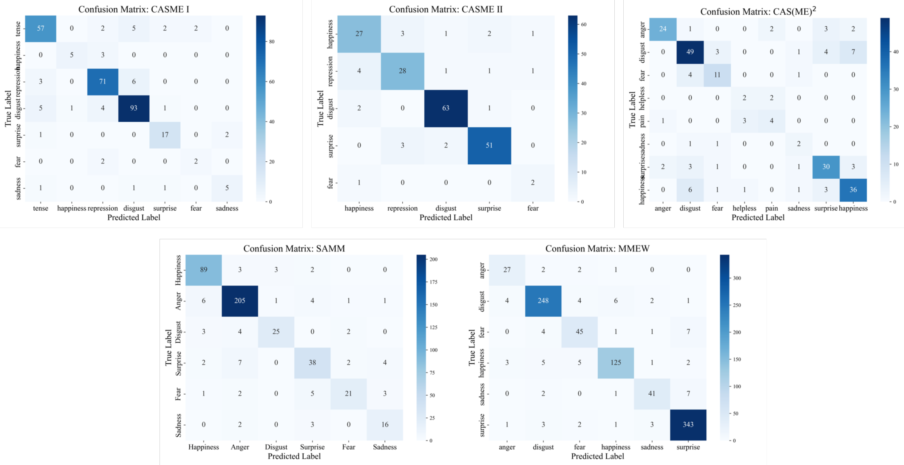 - CASME II [23]: CASME II builds on CASME with 247 spontaneous micro-expression samples from 26 participants. Videos were recorded at an improved 200 fps and 280 × 340 px resolution. Labeling combines AUs, subjective reports, and contextual video information, with ambiguous cases tagged as “others”. It is the most widely used dataset for MER.