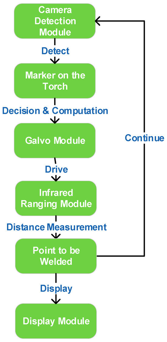 The proposed system integrates the foregoing algorithms into a unified hardware–software architecture to realize real-time 3D localization and visualization during welding. The hardware stack comprises a stereo vision sensor, an infrared range unit, and a controllable dual-axis galvo; the software stack combines deep learning detection, image processing, and 3D computation. The overall workflow is as follows: the camera first localizes the torch fiducials or other targets in pixel coordinates. Next, a YOLOv11 model detects the laser spot in the acquired image; the system drives the IR range sensor via the galvo to the target region to obtain the depth value, which is then fused in the camera coordinate frame to compute the target’s 3D coordinates. Meanwhile, precise galvo control enables the range sensor to rapidly refocus on regions of interest, supporting sequential measurements of multiple points. The ranging–detection loop is fully automated and maintains high efficiency and robustness under welding conditions.