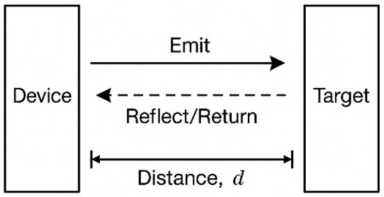 Infrared laser ranging provides an effective complement to monocular vision for depth compensation. IR ranging methods include laser triangulation and time-of-flight (ToF). Laser triangulation is shown in Figure 3 which exploits the geometric triangle formed by the emitter, the target, and the imaging receiver [28,29].