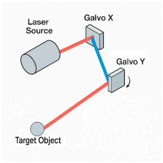 A galvanometer is an oscillatory electromagnetic actuator. When current flows through its coil, a torque is generated in the magnetic field that deflects the mirror against a return spring; to first order, the deflection angle is proportional to the drive current. Precise current control therefore enables real-time control of mirror tilt. A two-dimensional galvo comprises two orthogonal single-axis scanners (X and Y) that steer the laser horizontally and vertically, enabling rapid rastering of the target plane and millisecond-level precision scanning; a schematic is shown in Figure 4, and the experimental galvo assembly is shown in Figure 5.