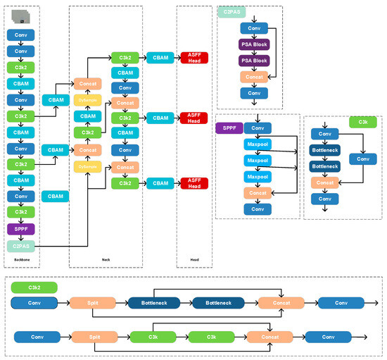 To enhance the feature expressiveness and small-object detection of YOLOv11, we co-optimize lightweight efficiency and accuracy within the original framework so that the model sustains high recall and real-time throughput in complex industrial scenes with welding fumes. Three modifications are introduced to the Backbone, Neck, and Head, as illustrated in Figure 6. In the Backbone, a Convolutional Block Attention Module (CBAM) is inserted to strengthen channel- and spatial-wise representation. In the Neck, the upsampling stages of the feature pyramid are replaced with DySample to recover finer details. Finally, in the Detection Head, an Adaptive Spatial Feature Fusion Head substitutes the original head to adaptively fuse multi-scale feature maps and reinforce target representation.
