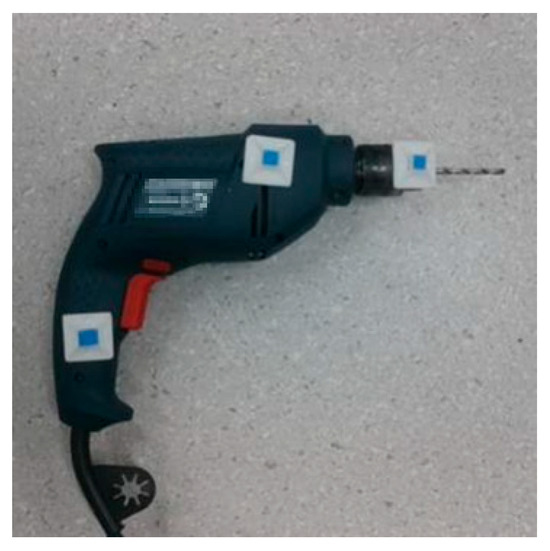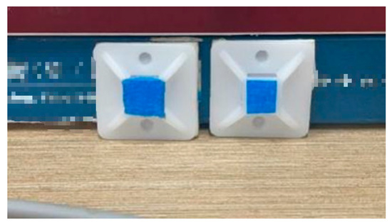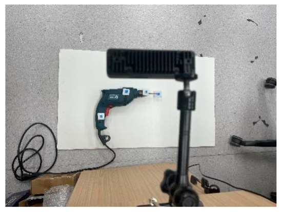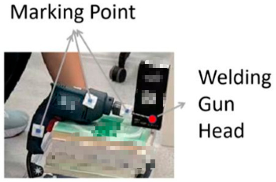 For the color-marker scheme, four blue stickers were attached around the mock torch tip (Figure 16). After stereo acquisition, the calibration routine estimated the torch end in the camera frame (Figure 17). For example, in one run the calibrated torch tip coordinates were [133.674, −104.902, 808.526] (camera frame). The result is saved (e.g., G_GUN.txt) for subsequent measurements. Figure 18 illustrates the simulated measurement scenario using color-markers.