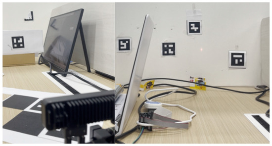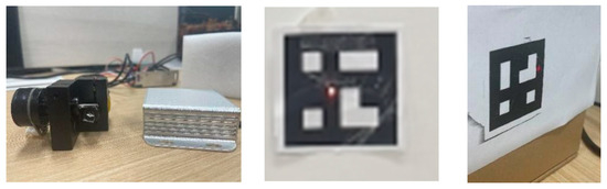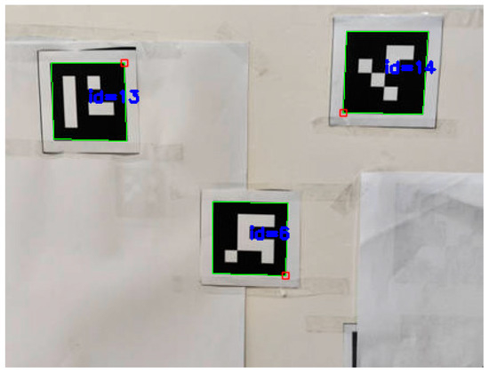 During detection, the image is first converted to grayscale to reduce computation; OpenCV’s ArUco library then identifies the marker and its corner coordinates. The marker center is obtained by averaging the four corners, yielding the image coordinates of the mark. Furthermore, given the known physical size of the ArUco code and the camera intrinsics, a PnP solution provides the marker pose relative to the camera, and from the four corner projections one estimates the rotation matrix R and translation vector t, i.e., the extrinsic matrix , enabling accurate 3D localization of the mark. Compared with color thresholding, the ArUco method is more robust to illumination and background variations and reliably recognizes the marker and estimates its position even under uneven lighting or clutter. Its unique ID also facilitates multi-marker association and tracking (in Figure 13).
