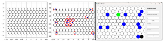 Visualization and interactive interface for the circular-grid layout. (Left) Generated 2-D mock welding-plate pattern; (center) example showing measured points alongside their estimated counterparts; (right) GUI window for interactive control.