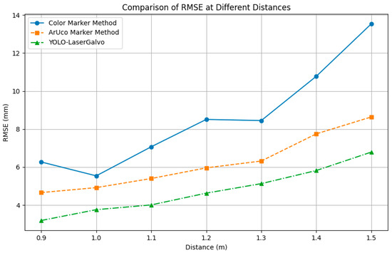 The YOLO–LaserGalvo approach consistently achieves the lowest RMSE/MAE with the mildest slope and the smallest fluctuations, indicating superior accuracy and stability. ArUco shows intermediate performance with an approximately linear increase, whereas the color-marker method exhibits the largest errors and a pronounced surge beyond 1.3 m, implying higher distance sensitivity and variability. In terms of RMSE, YOLO–LaserGalvo is typically ~40–50% lower than the color-marker method and ~20–30% lower than ArUco across most distances.
