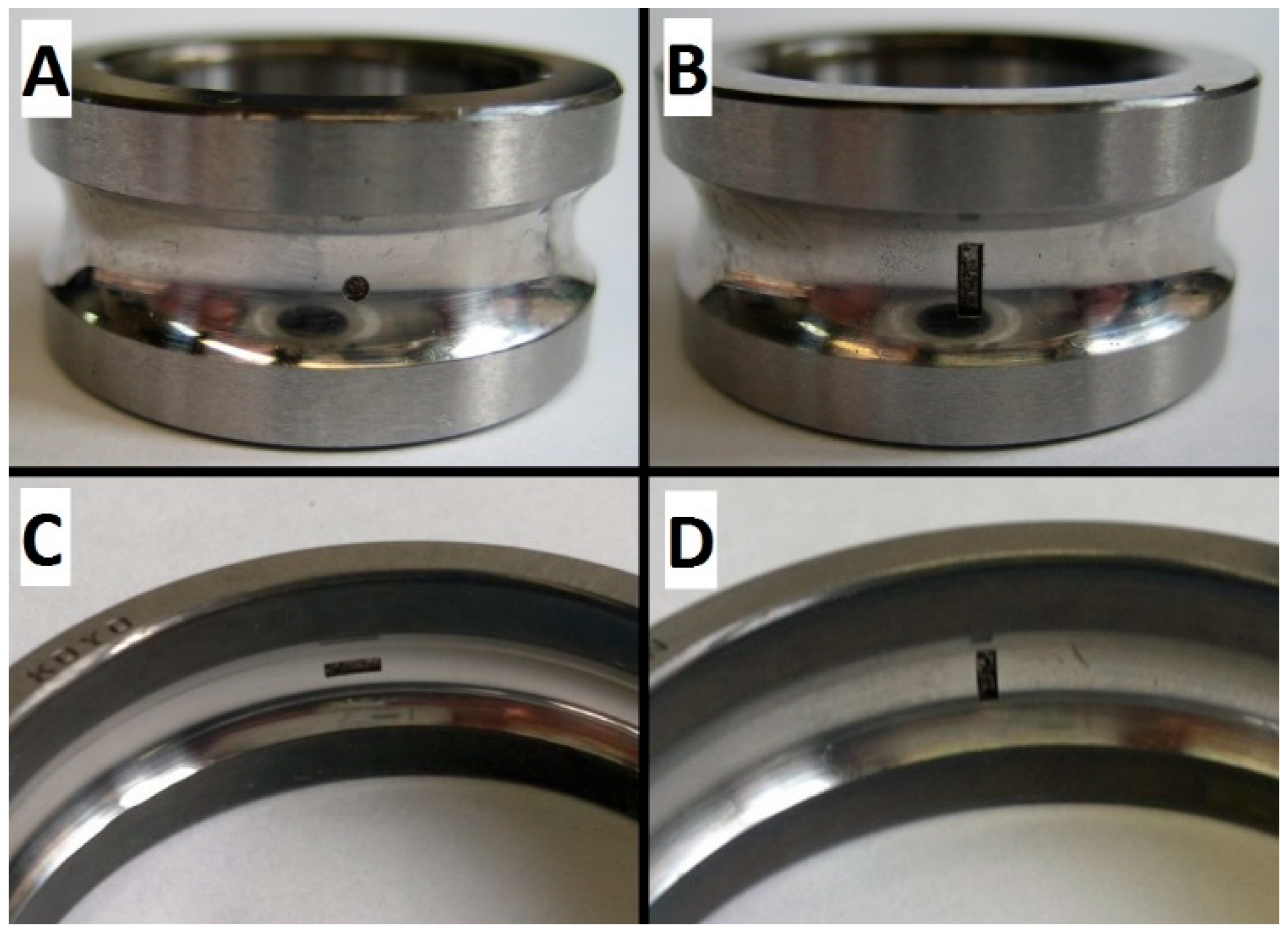 out2 | outer race scratch damage across the bearing rolling direction with length of 3 mm, width of 1 mm, and depth of 0.5 mm | Figure 3D |