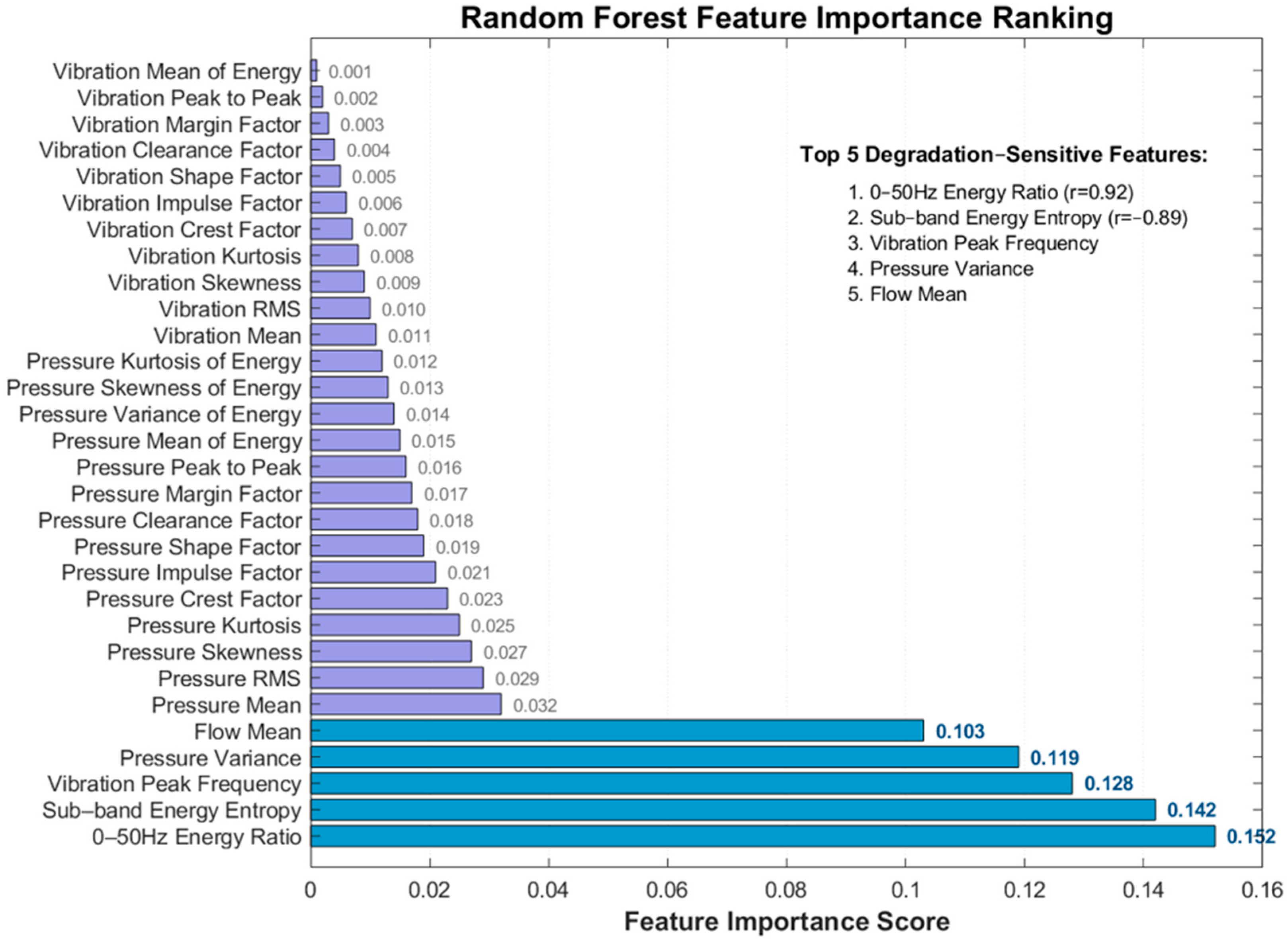 Fundamental Principle: Our framework learns a mapping from sensor data patterns to health states. Whether degradation is induced by parameter changes or natural wear, similar underlying physical faults (e.g., leakage, wear) manifest as analogous patterns in vibro-acoustic signals (e.g., frequency shifts, energy redistribution). Therefore, the model captures generally applicable degradation features. Specifically, our extracted features—such as the 0–50 Hz energy ratio (which decreases from ~65% to ~32% with degradation) and sub-band energy entropy (which increases from ~1.2 to ~2.8)—are direct physical indicators of valve performance loss, regardless of the exact degradation trigger.