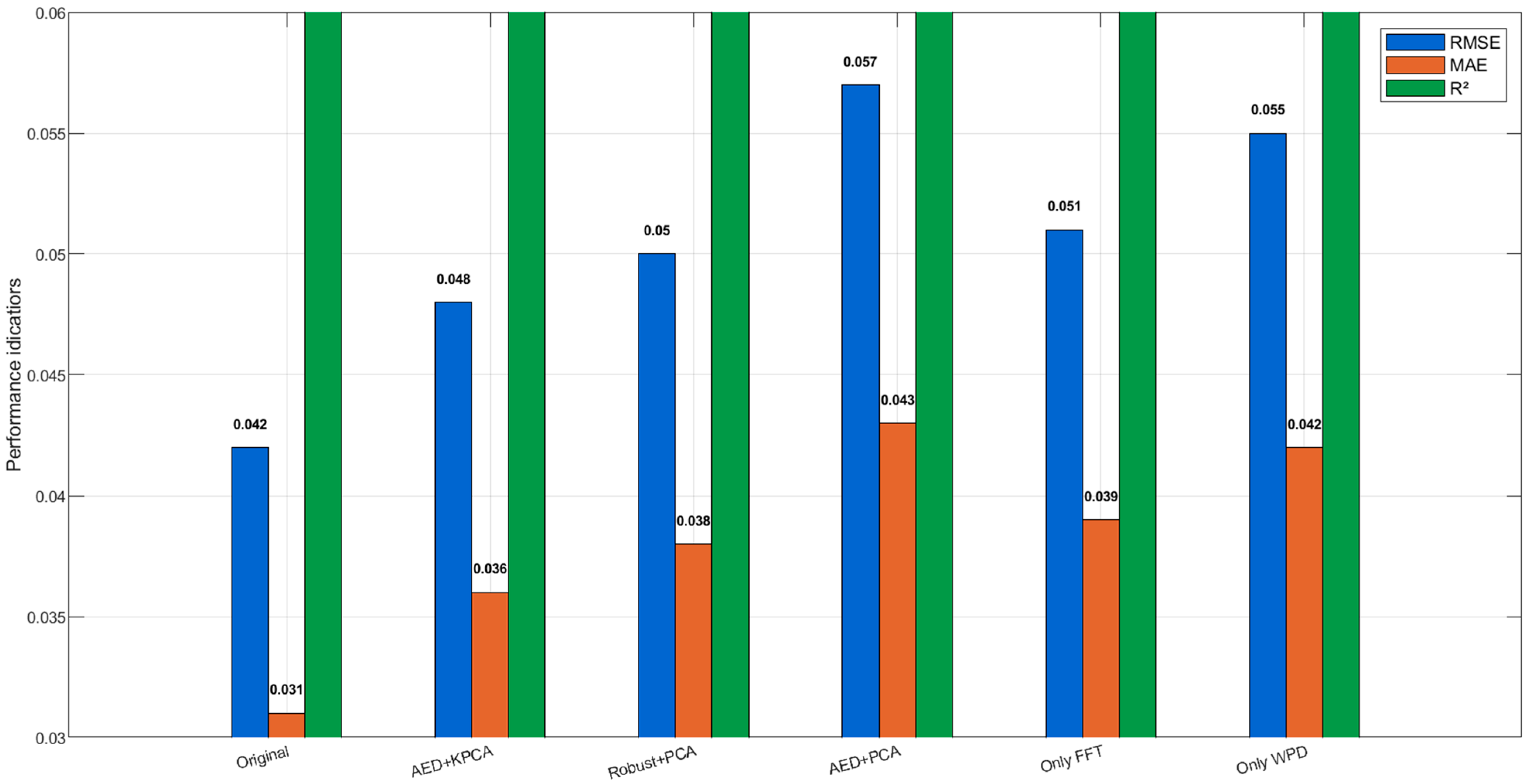 Quantitative comparison of RMSE, MAE, and R2 among the six schemes. The original method (Robust Scaler + KPCA) achieves the best performance (single experiment RMSE = 0.042, R2 = 0.987). Replacing Robust Scaler with AED (Ablation 1) or KPCA with PCA (Ablation 2) increases RMSE by 14.3% and 19.0%, respectively. The combined replacement (Ablation 3) leads to the largest degradation (RMSE = 0.057, +35.7%). Furthermore, using only FFT features (Ablation 4, RMSE = 0.051) or only WPD features (Ablation 5, RMSE = 0.055) results in RMSE increases of 21.4% and 31.0%, respectively, compared to the full feature fusion approach. The synergy between Robust Scaler and KPCA, combined with the complementary nature of FFT and WPD features, is therefore essential for maintaining high prediction accuracy.