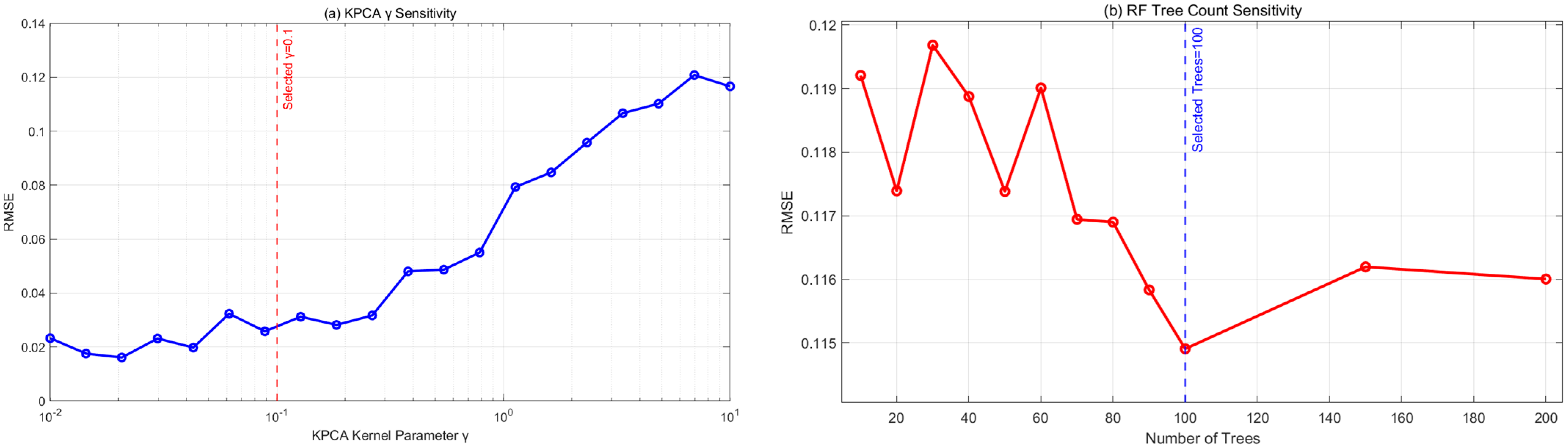 Figure 5a), the RMSE variation remains within 1% across the range of 0.01–0.4, with the core stable region located between 0.02 and 0.2 (RMSE variation < 0.5%). The optimal value of γ = 0.05 was ultimately selected, positioned at the center of the flat optimum region, effectively balancing nonlinear feature extraction and generalization performance.