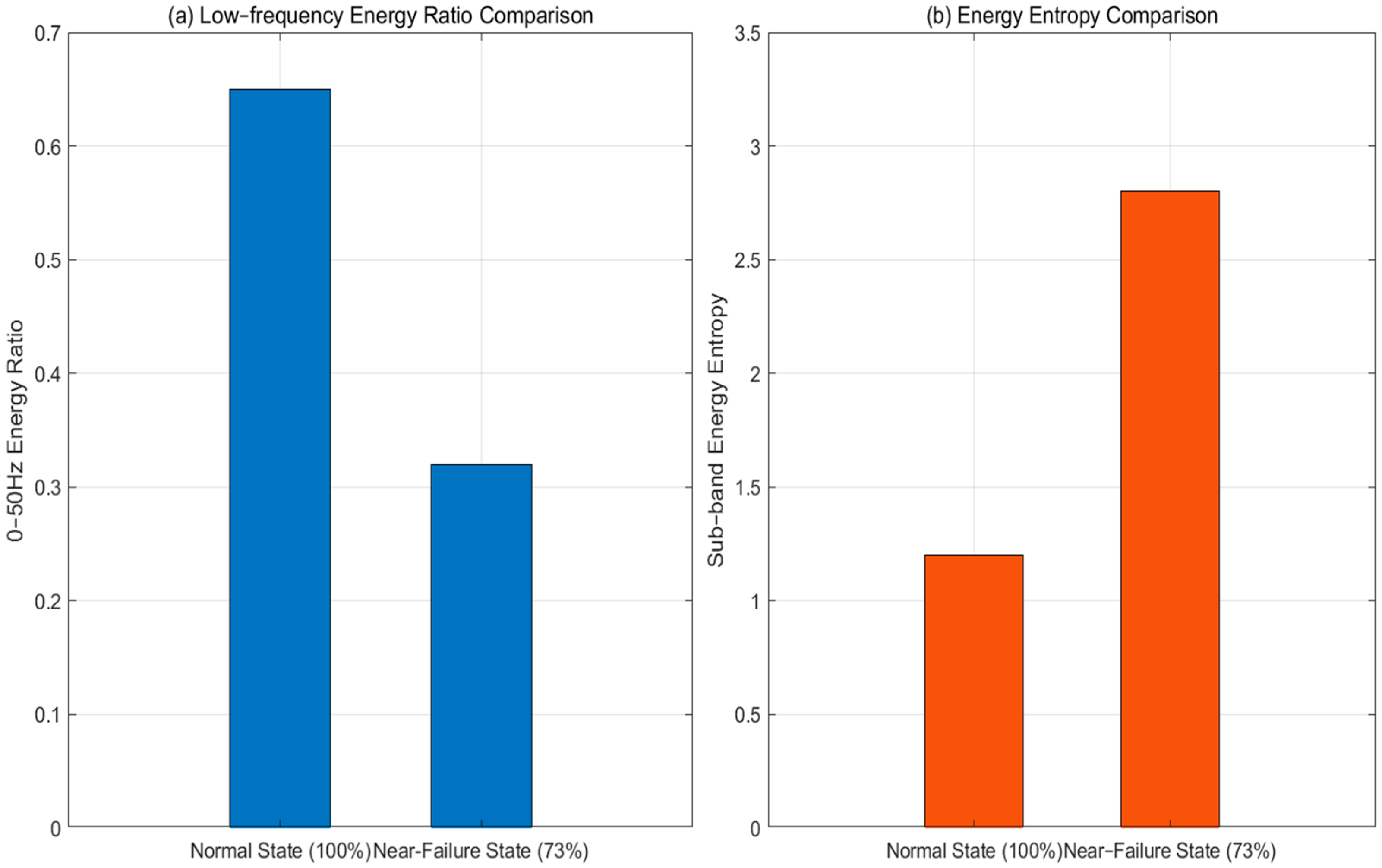 Figure 7 shows that in the normal state, low-frequency energy is concentrated (about 65%) and energy entropy is low (around 1.2). This indicates a relatively focused energy distribution. In the near-failure state, the low–frequency energy ratio drops to about 32%, while the entropy rises to around 2.8. This reflects a more dispersed energy distribution. These clear feature differences can effectively distinguish between degradation states.