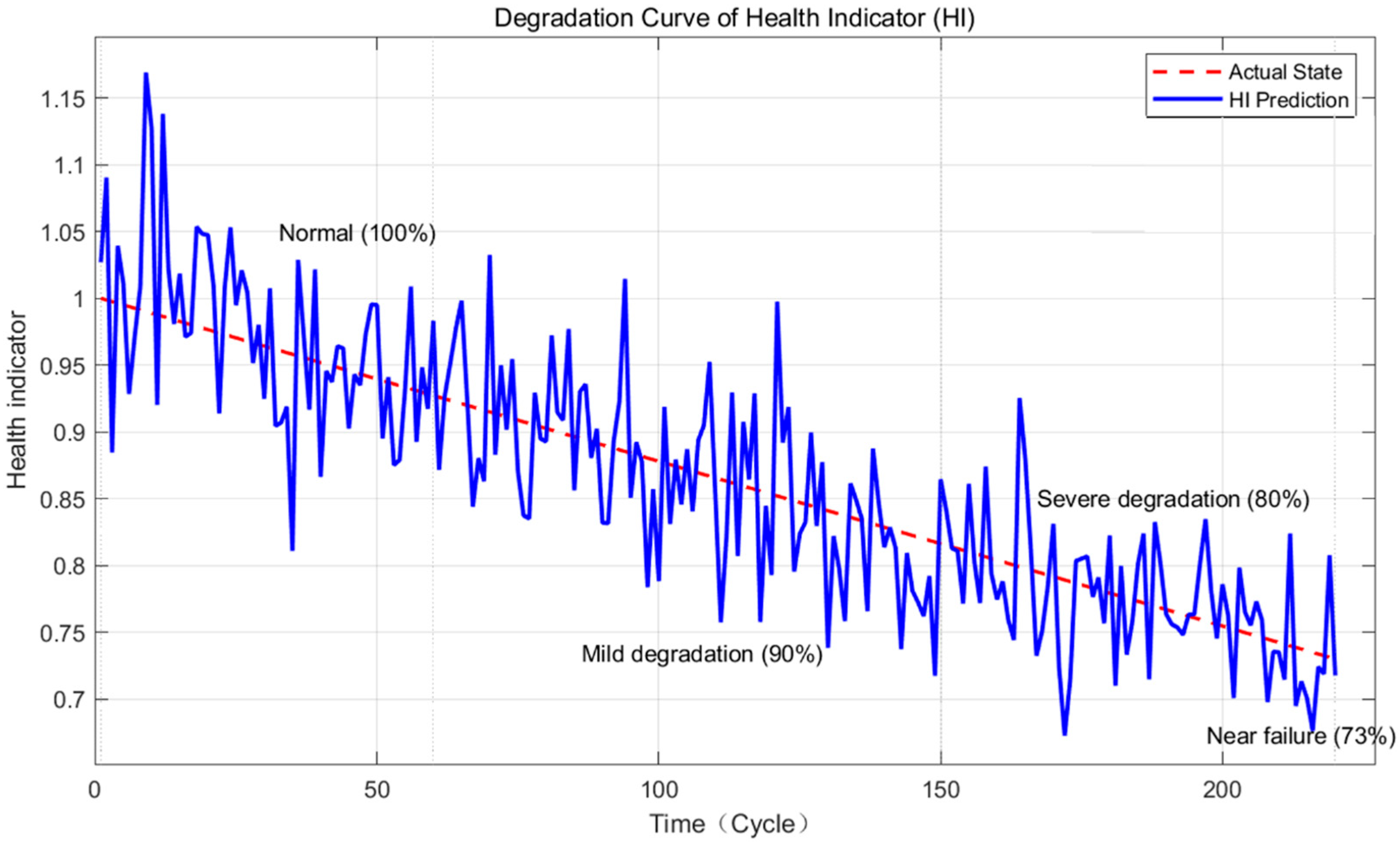 Figure 8 shows that the HI curve has a high trend consistency with the actual state (r = 0.96), and can clearly distinguish the four stages of normal (100%) → slight degradation (90%) → severe degradation (80%) → near failure (73%), realizing the quantitative characterization of the degradation process, similar to the graded visualization of degradation levels in nuclear-grade valves.