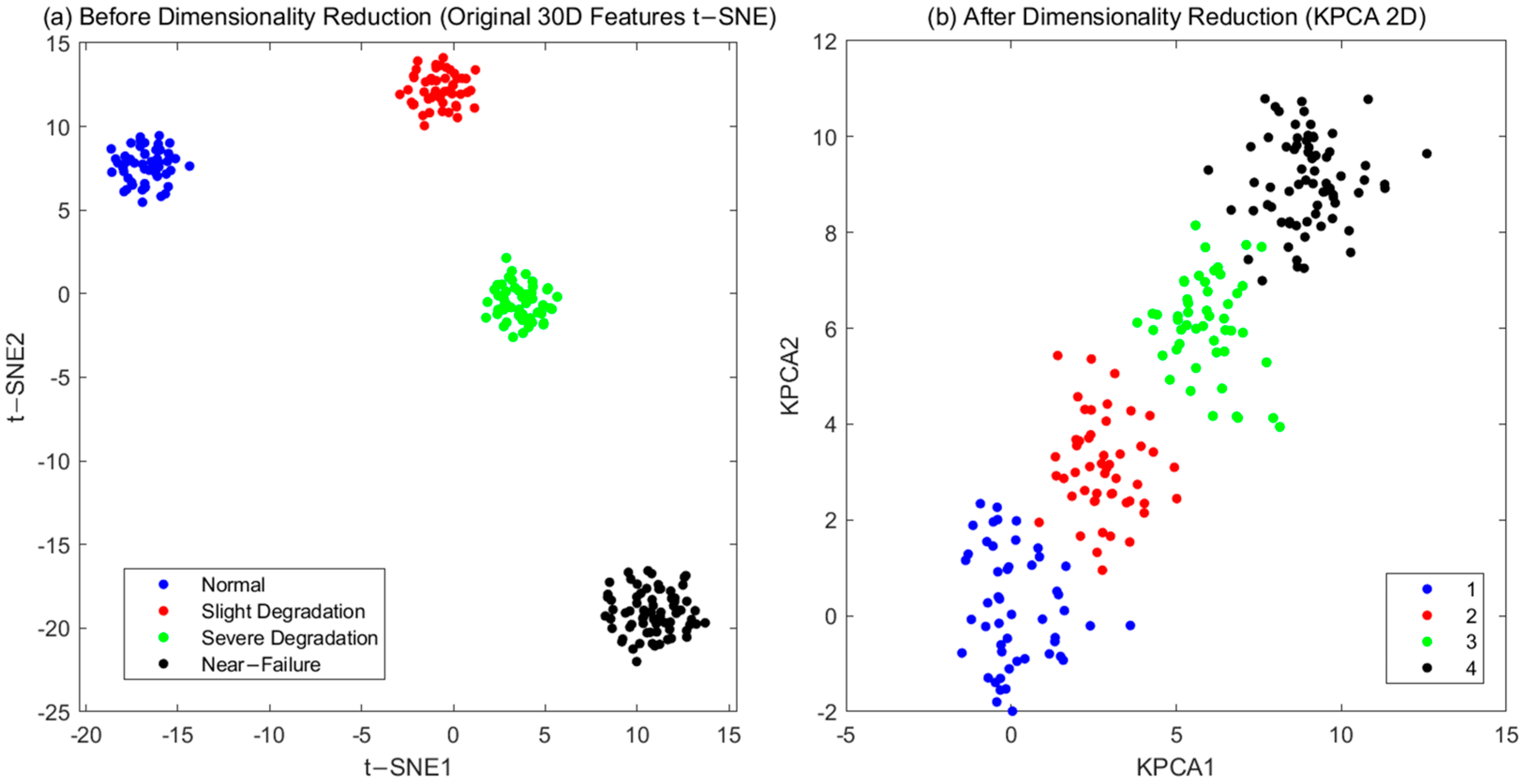 24]. After dimensionality reduction, the clustering of features in the same degradation stage is more concentrated (the average Euclidean distance of similar samples is reduced by 20% compared with that before dimensionality reduction,