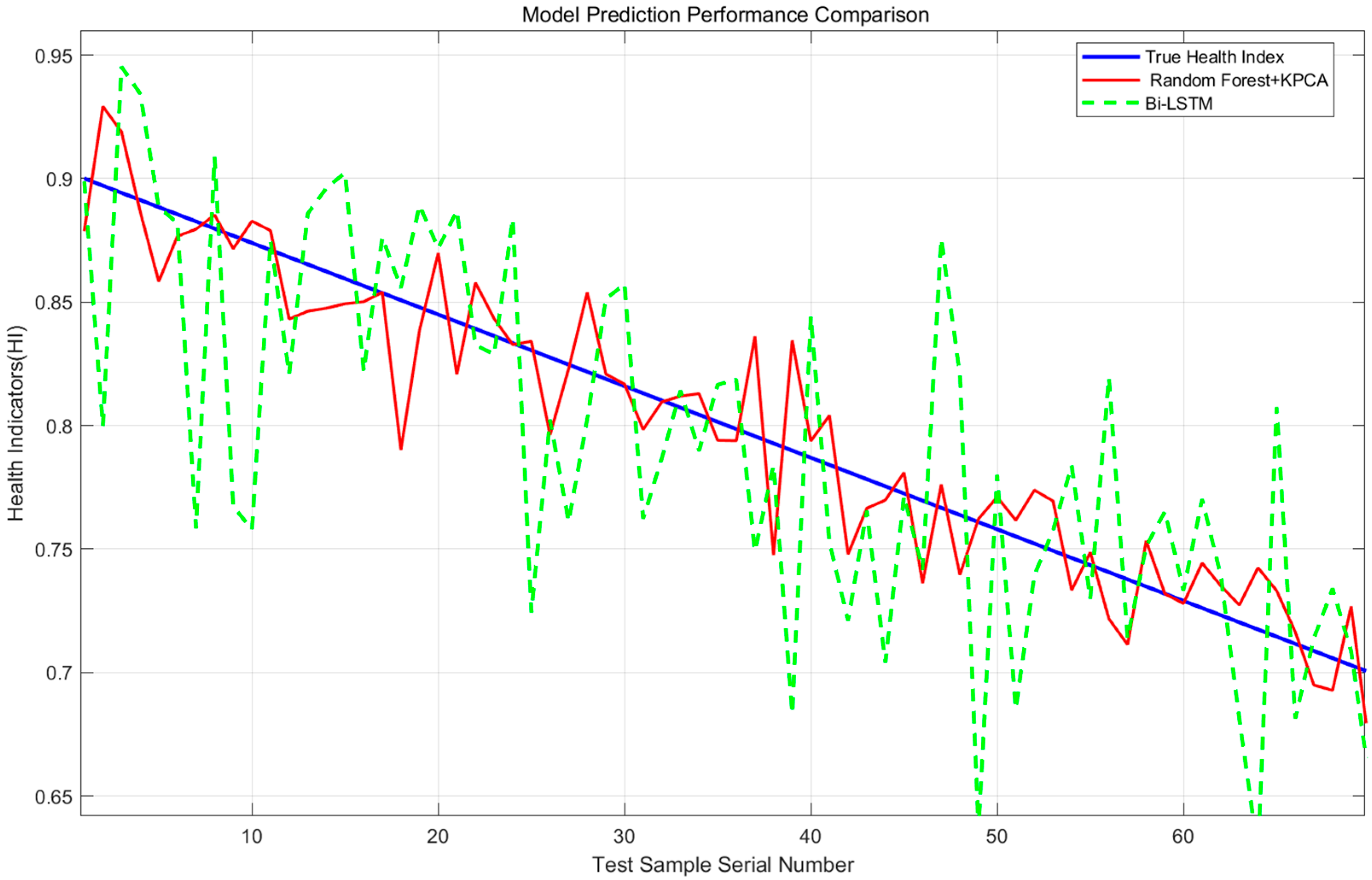 The results show that the random forest combined with KPCA has the best accuracy (RMSE = 0.0319). After KPCA dimensionality reduction, feature redundancy is reduced, and the accuracy is improved by 37.5%. Among deep learning models such as LSTM, GRU, and BiGRU, BiGRU performs relatively better (RMSE = 0.062), but due to the limited sample size (2205 cycles in total), the overall accuracy is still lower than that of random forest-related models. This further reflects the advantage of ensemble learning in small sample scenarios—it does not require a large amount of data to support model training and is more suitable for prediction with small sample data in industrial fields.