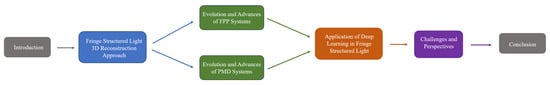 As illustrated in Figure 1, Section 1 introduces the research background and significance, while Section 2 starts from the general paradigm of fringe-structured-light 3D reconstruction, systematically presenting the principles of wrapped-phase extraction, phase unwrapping, and 3D shape recovery from phase, thereby laying the theoretical foundation for subsequent system evolution. Building on this paradigm, Section 3 focuses on the development of PMD systems, tracing their evolution from single-screen single-camera configurations to multi-screen direct PMD and multi-camera stereo PMD, gradually revealing their applicability and limitations in complex scenarios. In parallel, Section 4 shifts to FPP systems, analyzing the differences among mainstream projection technologies and examining calibration strategies and error modeling under MEMS-based projection, thereby highlighting challenges in accuracy and robustness. As traditional approaches increasingly reveal their shortcomings, Section 5 introduces the integration of deep learning into fringe-structured light, covering learning paradigms, network architecture innovations, supervision strategies, and input design, along with a discussion of evaluation metrics. Building upon these insights, Section 6 summarizes current challenges and outlines future research directions, including HDR imaging, extended depth of field, high-speed and real-time reconstruction, as well as the transferability and interpretability of deep learning methods. Finally, Section 7 concludes the paper by summarizing research progress and providing an outlook on future trends.