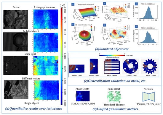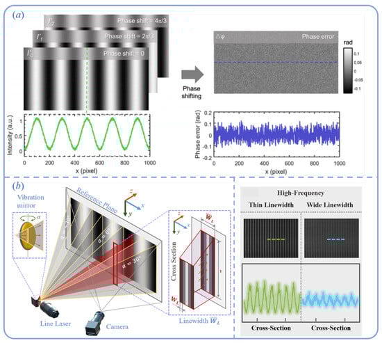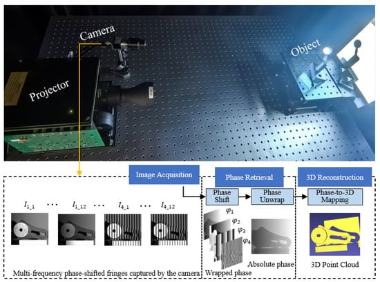Three-dimensional reconstruction technology is a key approach for recovering the spatial structure of objects from images or sensor data, and it has been widely applied in various fields such as industrial inspection, medical imaging, cultural heritage digitization, and virtual reality [1,2,3,4,5]. Based on the method of acquiring depth information, 3D reconstruction can be categorized into passive and active approaches. Passive methods rely on natural illumination and image matching—typical examples include stereo vision and multi-view geometry. However, their reconstruction accuracy is often limited by factors such as texture richness and occlusions, making them unsuitable for high-precision measurement tasks [6,7,8,9,10]. In comparison, active 3D measurement techniques maintain high reconstruction accuracy even in regions with weak or absent texture features. By introducing an additional structured light source, they provide phase information to the measured area, thereby improving the accuracy and completeness of the 3D surface data. The laser triangulation method relies on the principle of triangulation rather than phase information for reconstruction [11,12]; however, due to its line-scanning nature, its speed is generally lower than that of area-based structured-light methods. The Time-of-Flight (TOF) method estimates depth information by measuring the travel time of laser pulses between the detector and the object, and it is typically applied in large-scale scenarios on the order of hundreds of meters [13,14].