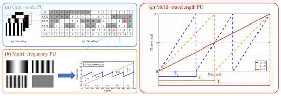 TPU refers to a class of methods that project multiple fringe patterns with different frequencies or encodings, and compute the absolute phase independently for each pixel based on the temporal variation in grayscale intensity. These methods do not rely on spatial continuity of the phase map, making them highly robust for surfaces with steep variations, discontinuities, or occlusions [52]. Depending on the type of modulation encoding used, TPU methods can be further classified into the following: Gray-code Phase Unwrapping, Multi-frequency Phase Unwrapping, Multi-wavelength Phase Unwrapping.