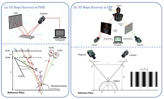 PMD is an optical measurement technique specifically designed for 3D reconstruction of specular or highly reflective surfaces. As shown in the top part of Figure 5a, a typical PMD system consists of a liquid crystal display (LCD), a camera, and a computer. The computer generates sinusoidal fringe patterns and displays them on the LCD. These patterns are reflected by the mirror-like surface of the object and then captured by the camera. Because the specular surface geometrically modulates the fringe pattern, the captured image contains phase distortion information caused by variations in the surface normal [67,68]. After extracting the wrapped phase from the captured fringe images using techniques such as phase-shifting, the system uses a geometric model and calibration parameters to convert the phase information into the surface gradient data of the object [69]. Since the phase is proportional to the deflection angle of the surface normal vector, PMD essentially measures a gradient field that reflects the surface slope. To reconstruct the full 3D shape of the object, this gradient field must be numerically integrated over the 2D image plane to recover the relative height at each pixel, thereby producing the complete 3D surface profile [70].