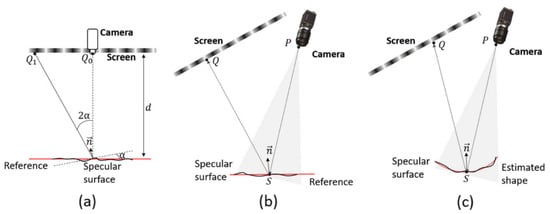 To overcome the limited measurement flexibility inherent in the paraxial approximation model, researchers have proposed the reference-plane-based model, as illustrated in Figure 7b. This method assumes that the measured specular object is adjacent or approximately parallel to a known reference plane in space. By leveraging a geometric relationship among three key points—the image point P, the object point S, and the projection point Q—the surface gradient at point S can be derived. Compared to the paraxial approximation model, this model places fewer constraints on the geometric configuration of system components, offering greater flexibility. Huang et al. developed a fast measurement system based on this structure and used the Windowed Fourier Transform algorithm to achieve dynamic 3D reconstruction from a single-frame image, successfully capturing temporal deformations of water surface perturbations [96]. Li et al. further investigated the impact of reference plane positioning errors on measurement accuracy and introduced dual-laser-assisted positioning and confocal white-light distance sensors to improve spatial localization of the reference plane [97]. However, this model is mainly applicable to nearly flat surfaces. For objects with significant curvature or large deviations from the reference plane, its measurement accuracy degrades noticeably.