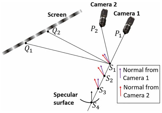 To overcome the limitations of single-screen PMD systems in terms of surface normal estimation accuracy and visible measurement area, multi-screen configurations in direct PMD have been developed. As shown in Figure 8, such systems incorporate two or more display screens into the scene, allowing the viewing ray reflected from the measured point to pass through multiple known fringe patterns. This enables more stable and accurate reconstruction of surface normal [102,103,104].