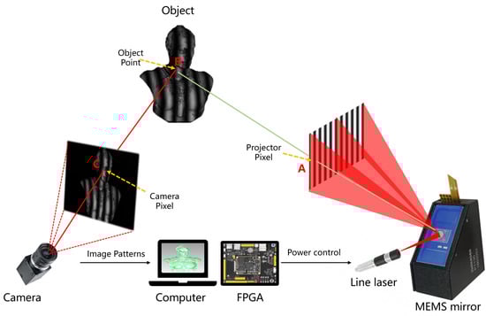 Among various active techniques, structured light has emerged as a mainstream approach for high-precision 3D reconstruction at close range [15,16,17,18], owing to its high resolution, accuracy, and system flexibility [19,20,21]. It is widely applied in scenarios such as industrial surface inspection [22,23], facial recognition [24,25], and 3D modeling [26,27]. Most structured-light systems are based on phase encoding principles and can be broadly categorized into two representative methods: FPP and PMD. FPP is suitable for diffuse surfaces and reconstructs 3D shapes by projecting multiple phase-shifted fringe patterns and extracting their phase. In contrast, PMD is designed for specular or highly reflective surfaces, acquiring gradient information by analyzing the phase variations of reflected fringe patterns, from which the 3D structure is reconstructed [28,29,30]. Depending on the projection mechanism, FPP systems can be implemented in several ways, with the most common being DLP projectors and MEMS-based micromirror systems. DLP systems offer high pattern quality and fast refresh rates, making them the dominant solution. While DLP projectors have been extensively studied and widely applied in structured-light systems, discussions often focus on their optical design and depth-of-field characteristics. In comparison, micro-electro-mechanical systems (MEMS)-based projection has received relatively less attention, despite offering distinctive advantages. By generating patterns through laser scanning, MEMS projectors naturally enable large depth-of-field projection without the need for additional focusing optics. Moreover, their compactness and lightweight design make them well-suited for complex environments and mobile platforms [31,32]. In recent years, MEMS projection has attracted increasing attention as a promising direction for lightweight structured-light systems.