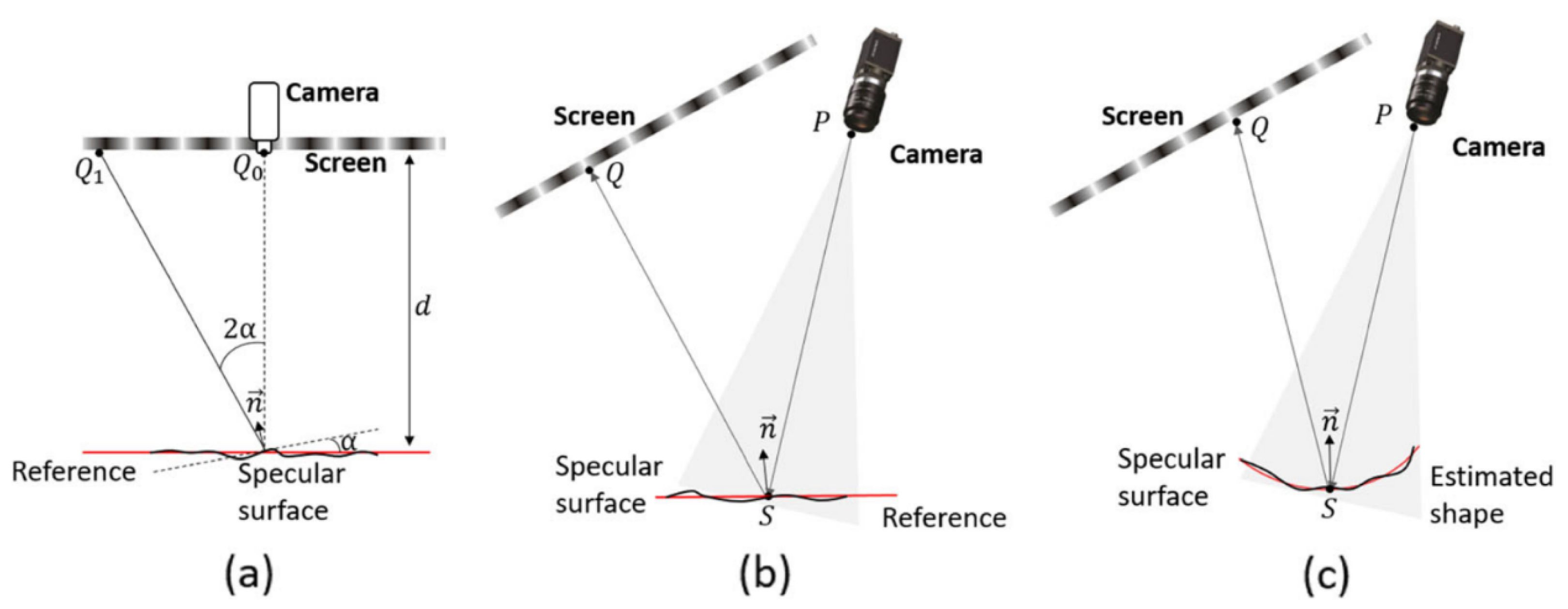- Burke, J.; Pak, A.; Höfer, S.; Ziebarth, M.; Roschani, M.; Beyerer, J. Deflectometry for specular surfaces: An overview. Adv. Opt. Technol. 2023, 12, 1237687. [Google Scholar] [CrossRef]