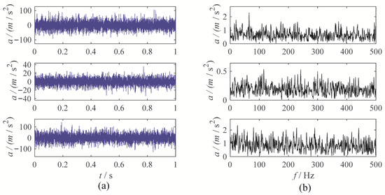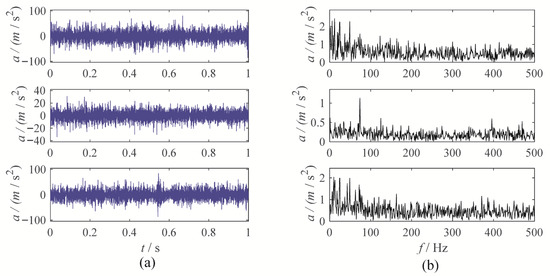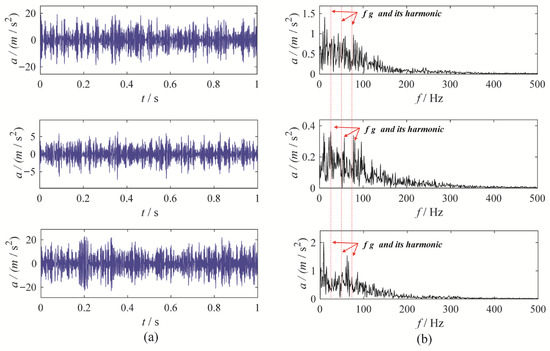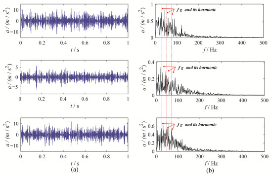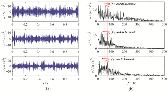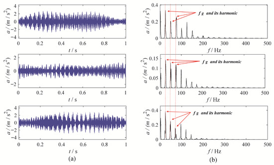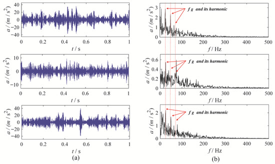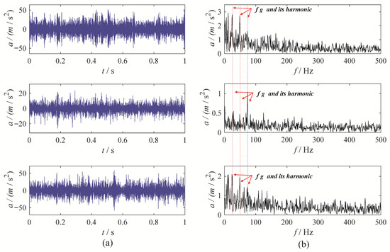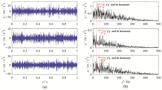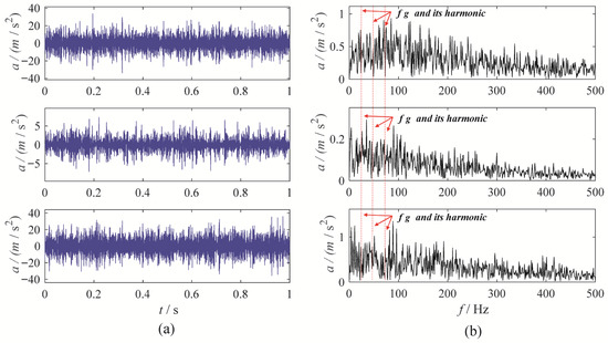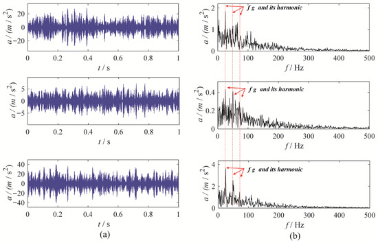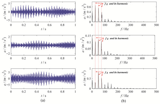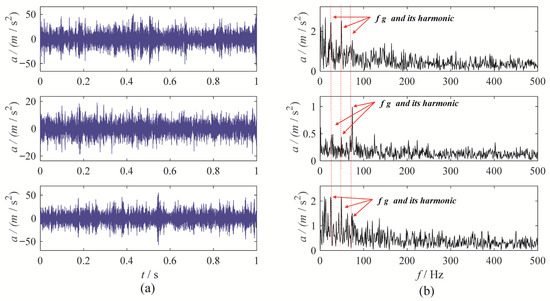 A gear chunk missing multi-channel fault diagnosis experiment is designed to evaluate the decomposition performance of MBMD. In this experiment, the motor speed is set to 1500 RPM, with the fault characteristic frequency fixed at 25 Hz. Vibration data is collected simultaneously from three channels—X, Y, and Z—using accelerometers. Figure 3 illustrates the time-domain waveforms of the vibration signals from these three channels, along with their corresponding envelope spectra.