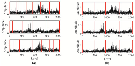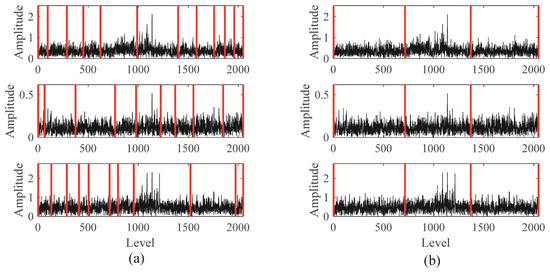 The Blaschke multi-spectrum and segmentation result is shown in Figure 4 (Each sub-figure in Figure 4 corresponds to the Blaschke multi-spectrum of the signals shown in Figure 3). Upon examination, it is evident that the multi-spectrum is divided into four distinct regions by the shared spectral lines, with each region demonstrating varying levels of energy concentration. Upon observation, we can see that the Blaschke spectrum of the multivariate signal is divided into four intervals by the common spectral lines, with each interval showing an energy concentration trend. Among these, the third spectral interval of the first and third channels, as well as the second spectral interval of the second channel, exhibit the most pronounced energy concentration trend. The regions with the most evident energy concentration trend also correspond to the spectral areas associated with the gear fault modes.
