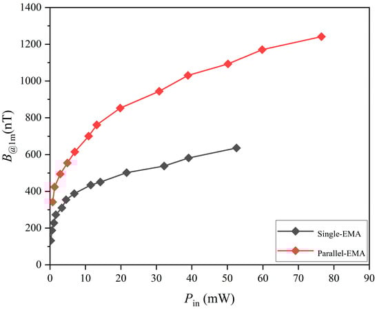 Figure 6 was examined in greater detail. The curve corresponding to the parallel-EMA configuration clearly exhibits a steeper slope in the higher-power regime, indicating that the enhancement effect becomes most prominent at relatively elevated driving powers. This trend suggests that the magnetic coupling between the two EMAs is capable of compensating for the intrinsic radiation inefficiency that typically arises at higher excitation levels, thereby extending the usable dynamic range of the antenna system. At the same time, the single EMA shows a slower growth in magnetic flux density, reflecting the limitations of a solitary resonant structure in sustaining efficient energy conversion as the input power increases. As the driving power continues to rise, both curves gradually enter a saturation region. Nevertheless, the parallel configuration consistently outperforms the single EMA by a substantial margin, underscoring the robustness of magnetic coupling in maintaining superior field radiation efficiency. This behavior is particularly relevant for scenarios that demand stable ELF transmission under variable excitation conditions, where the parallel-EMA system can provide stronger and more reliable signals without requiring excessive increases in input power. From the quantitative measurements, the parallel-EMA system (at the optimal spacing of