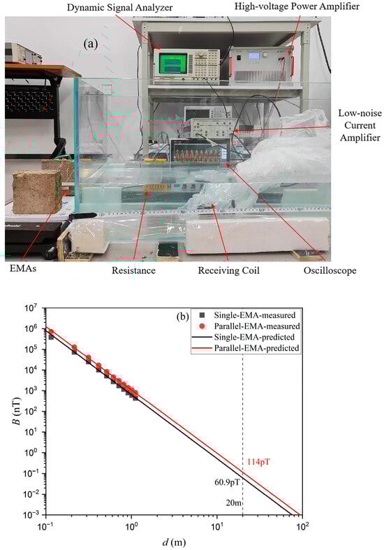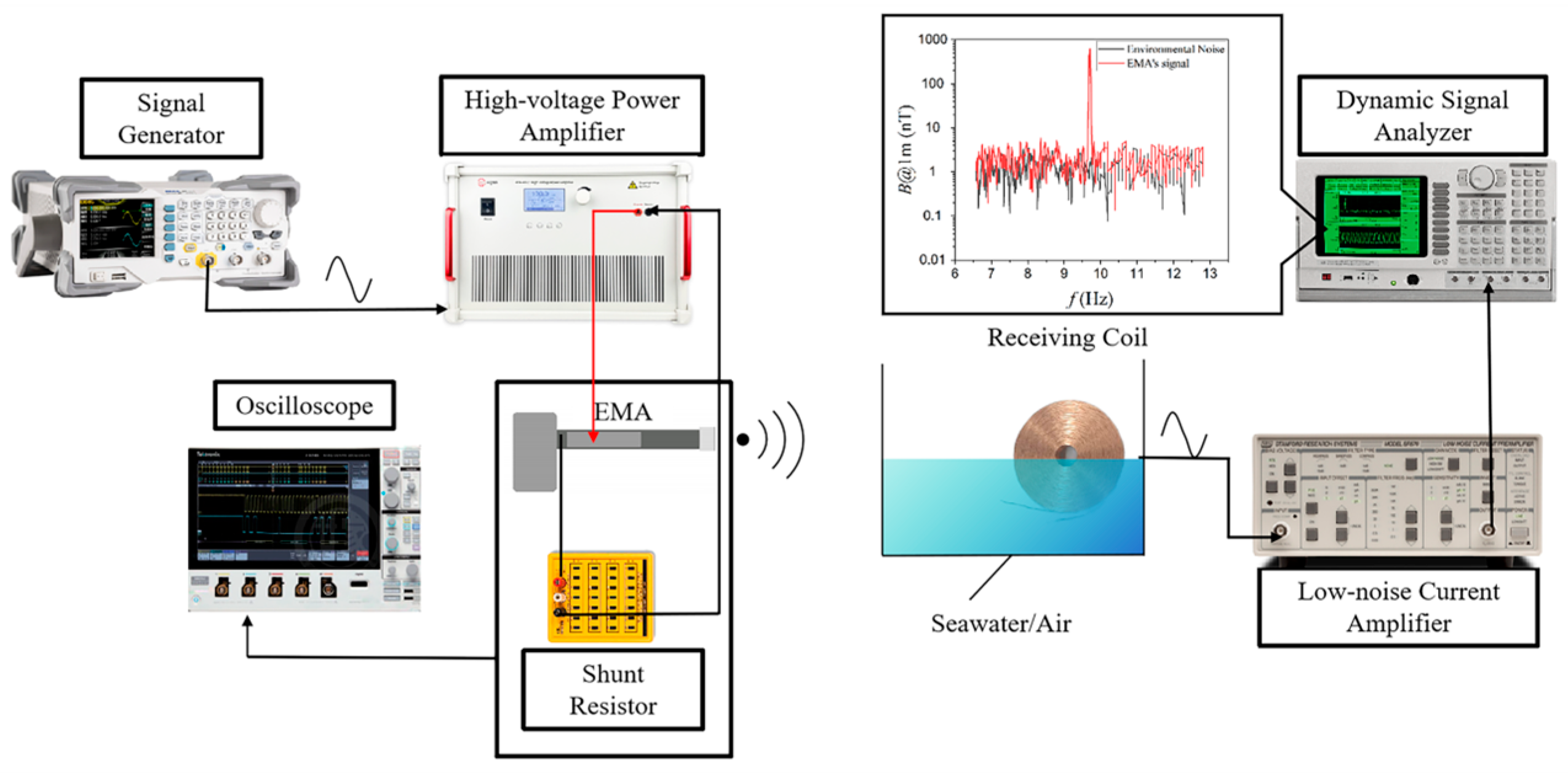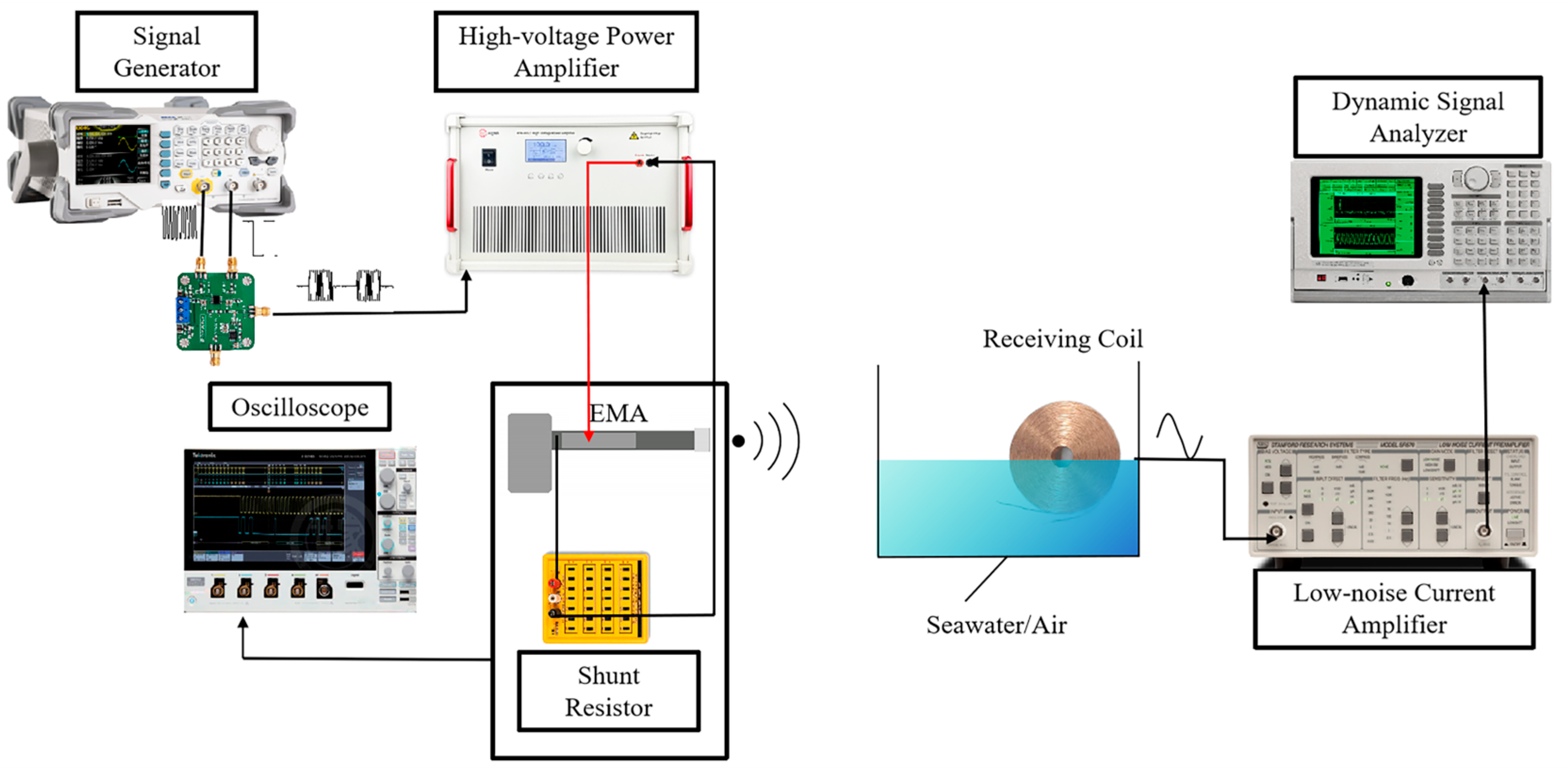 Figure 3. It consisted of a signal generator (RIGOL DG1022Z, RIGOL Technologies Co., Ltd., Beijing, China), a high-voltage power amplifier (Aigtek ATA4052, Aigtek Co., Ltd., Xi’an, China), a dynamic signal analyzer (SRS SR785, Stanford Research Systems, Inc., Sunnyvale, CA, USA), and a low-noise current preamplifier (SRS SR570, Stanford Research Systems, Inc., Sunnyvale, CA, USA). A 100 Ω shunt resistor was connected in series with the EMA to monitor input current. Because the operating frequency was extremely low, the induced signal was captured by a 3710-turn copper receiving coil, which was pre-calibrated in-house. The coil was placed in a 1.2 m × 40 cm water tank. For air measurements, the tank was empty, while for seawater tests, seawater was added and the coil was submerged. The output was then amplified and analyzed by the current amplifier and dynamic signal analyzer. This setup enabled detection of weak ELF signals with adequate sensitivity. To reduce environmental ELF noise, all possible interfering devices were switched off, and tests were carried out late at night when background disturbances were minimal. To monitor drive conditions and calculate input power, a digital oscilloscope was connected in parallel to the amplifier output and across the 100 Ω shunt resistor. The oscilloscope recorded the time-domain drive voltage (