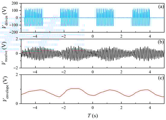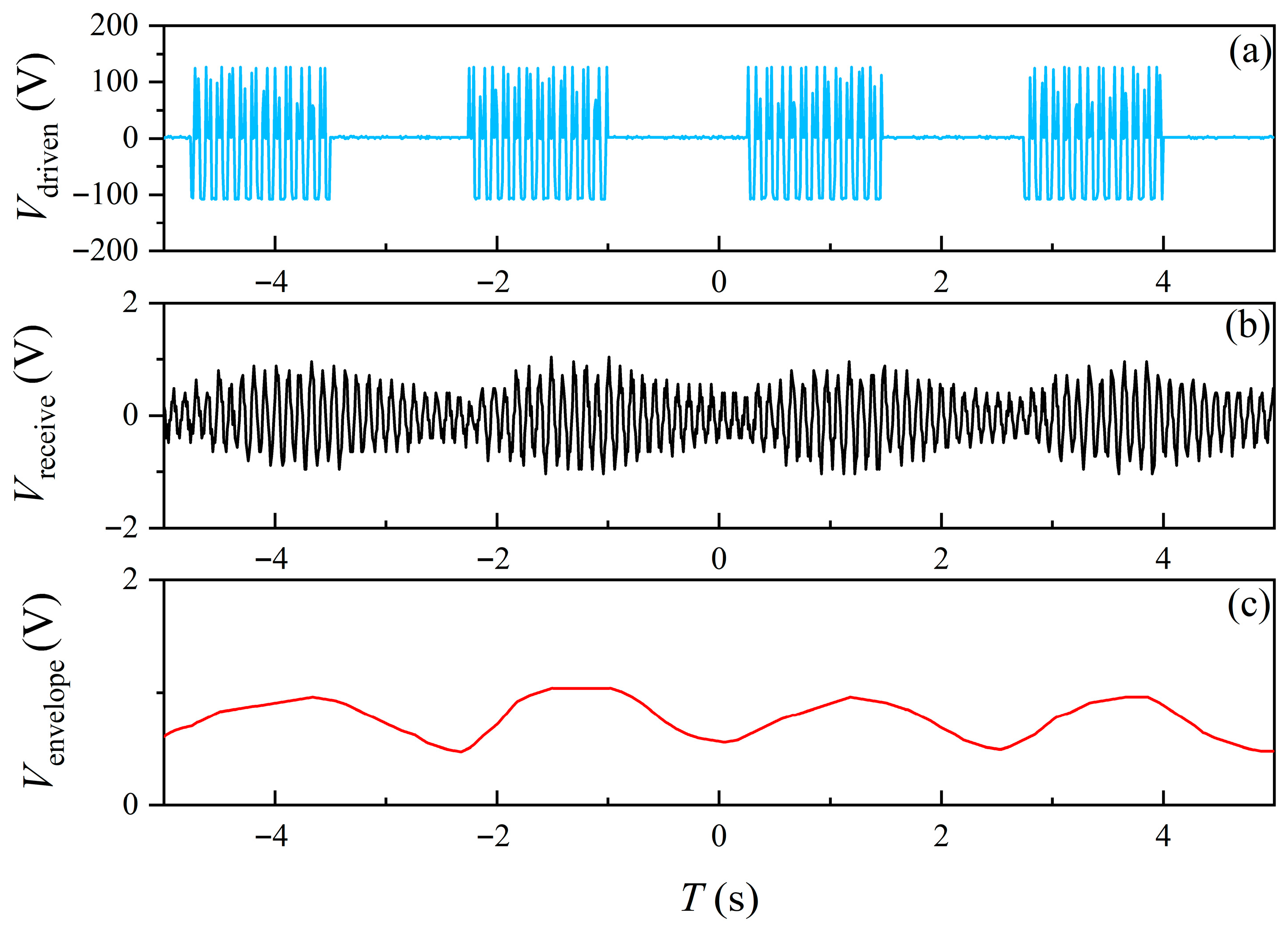 ) for the transmitting EMA, where the sinusoidal carrier is periodically switched on and off according to the digital sequence. The observed peak driving voltage was about ±150 V, sufficient to generate detectable magnetic flux density in seawater. The blank intervals represent the “0” symbols, while the sinusoidal bursts correspond to the “1” symbols.