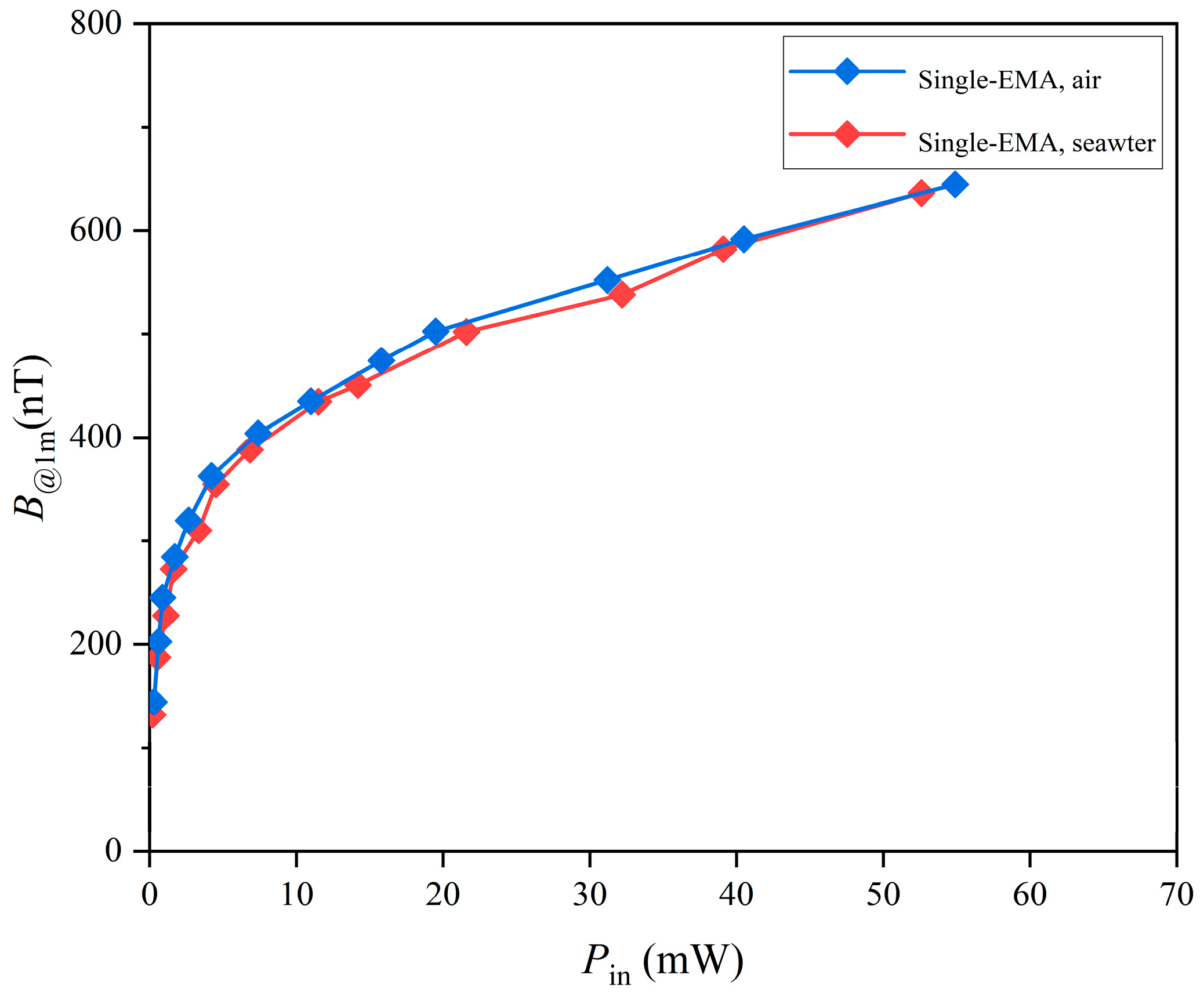 Pin was below 10 mW, the magnetic flux density increased rapidly with power, but the growth saturated at higher levels, indicating that increasing drive power does not indefinitely enhance EMA radiation. At 54.9 mW, the measured flux density reached 644.5 nT at 1 m in seawater. At 10 Hz, the background geomagnetic noise in air has been reported in the literature to be on the order of 200 pT [