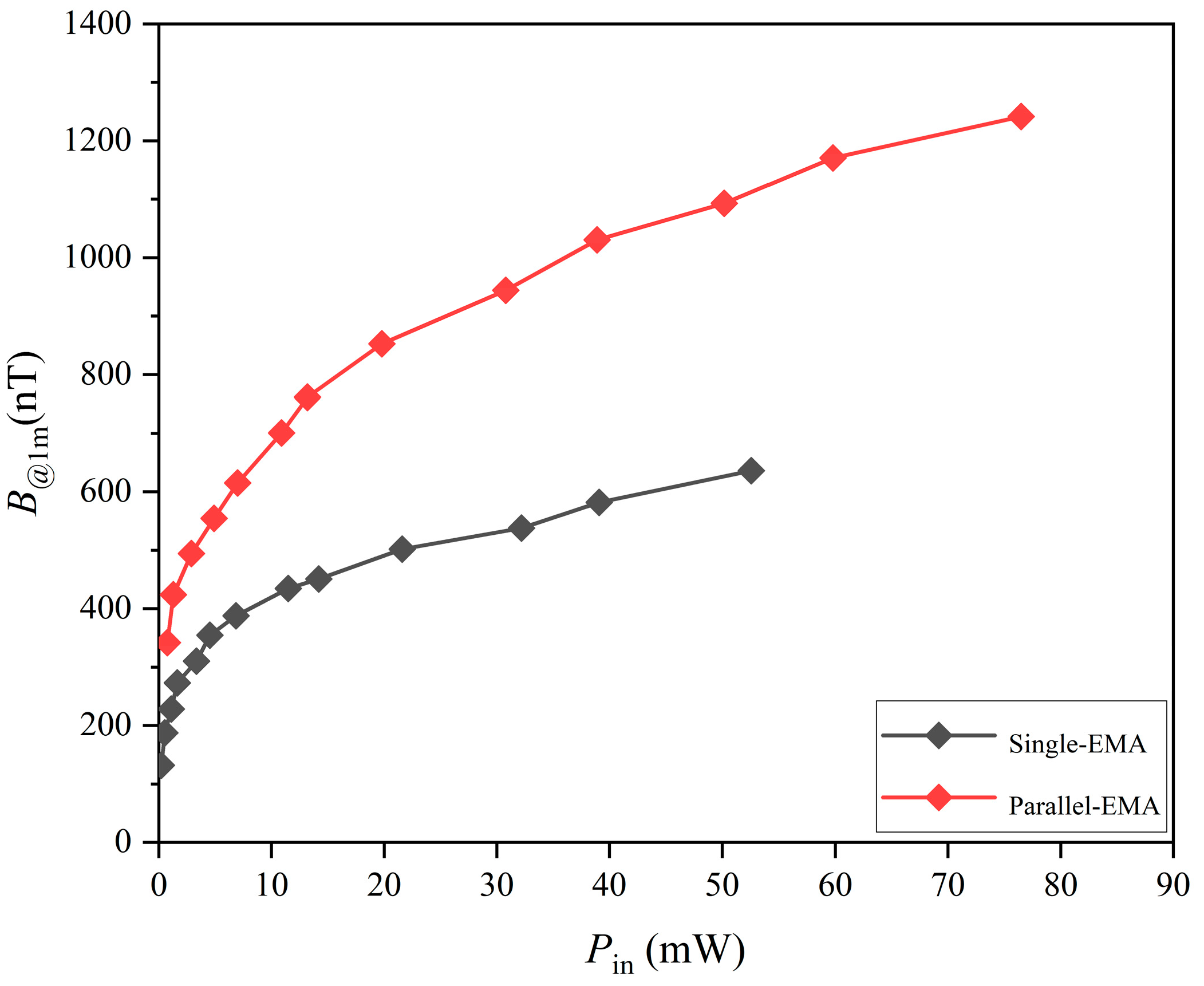 Beyond efficiency, the parallel configuration also mitigates the saturation of EMA radiation strength at high input powers. By distributing the load across multiple units, the system avoids excessive stress on individual actuators and supports higher driving powers with stronger outputs. This directly addresses a limitation of current miniaturized ELF mechanical antennas, where radiation is restricted by power saturation. These results demonstrate that parallel EMA architectures offer a practical route to achieving stronger and more stable radiation in compact ELF systems.