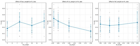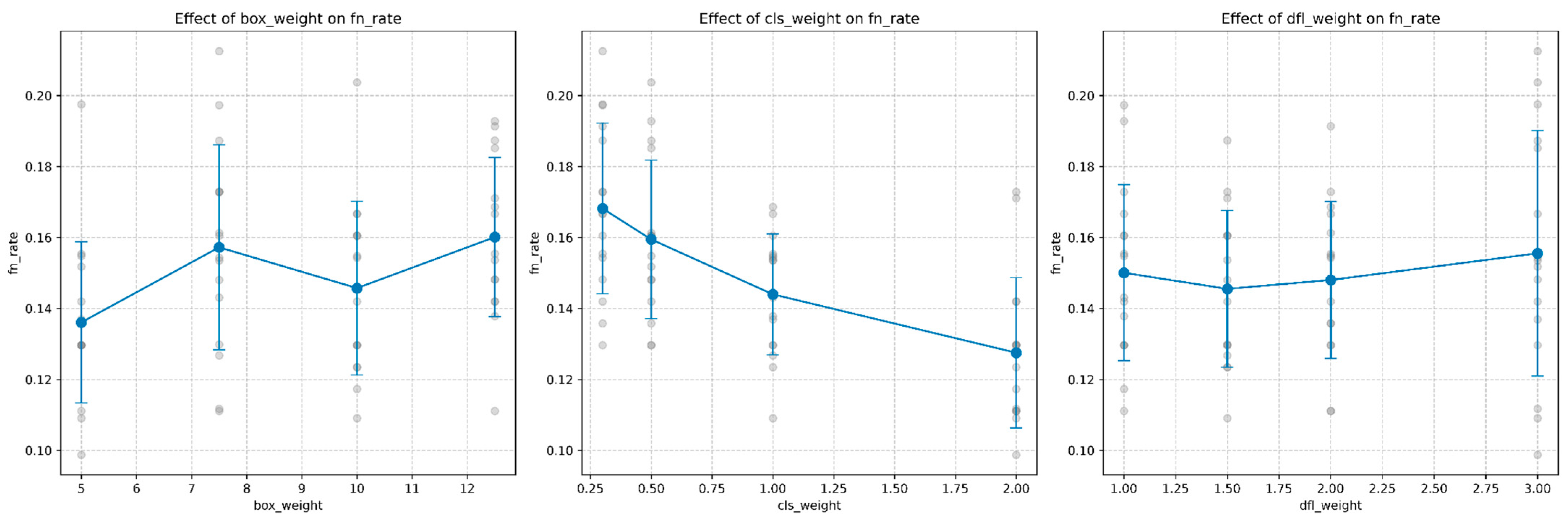 - Classification loss weight (λcls) has the strongest influence on reducing false negative rates, with higher values consistently improving detection completeness.