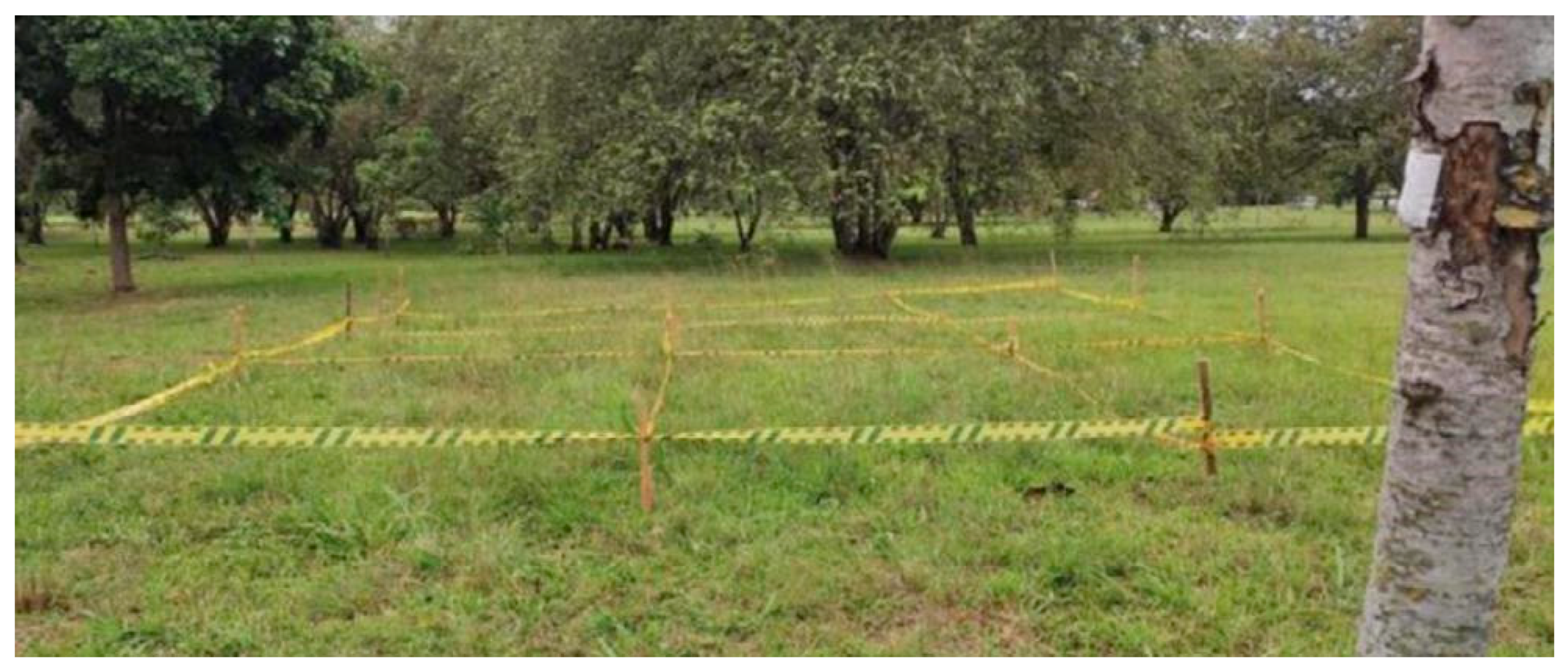 Controlled experimental test site for thermal landmine signature acquisition. The 10 m × 10 m area contains nine marked zones with imitation landmines buried at depths of 0, 1, 5, and 10 cm, plus one mine-free control zone. Yellow boundary markers enable precise spatial registration for drone-based thermal imaging validation. Site selection criteria included non-saline soil composition (pH 5.73) and minimal vegetation interference to maximize thermal contrast during optimal acquisition windows (17:00–18:00 h).