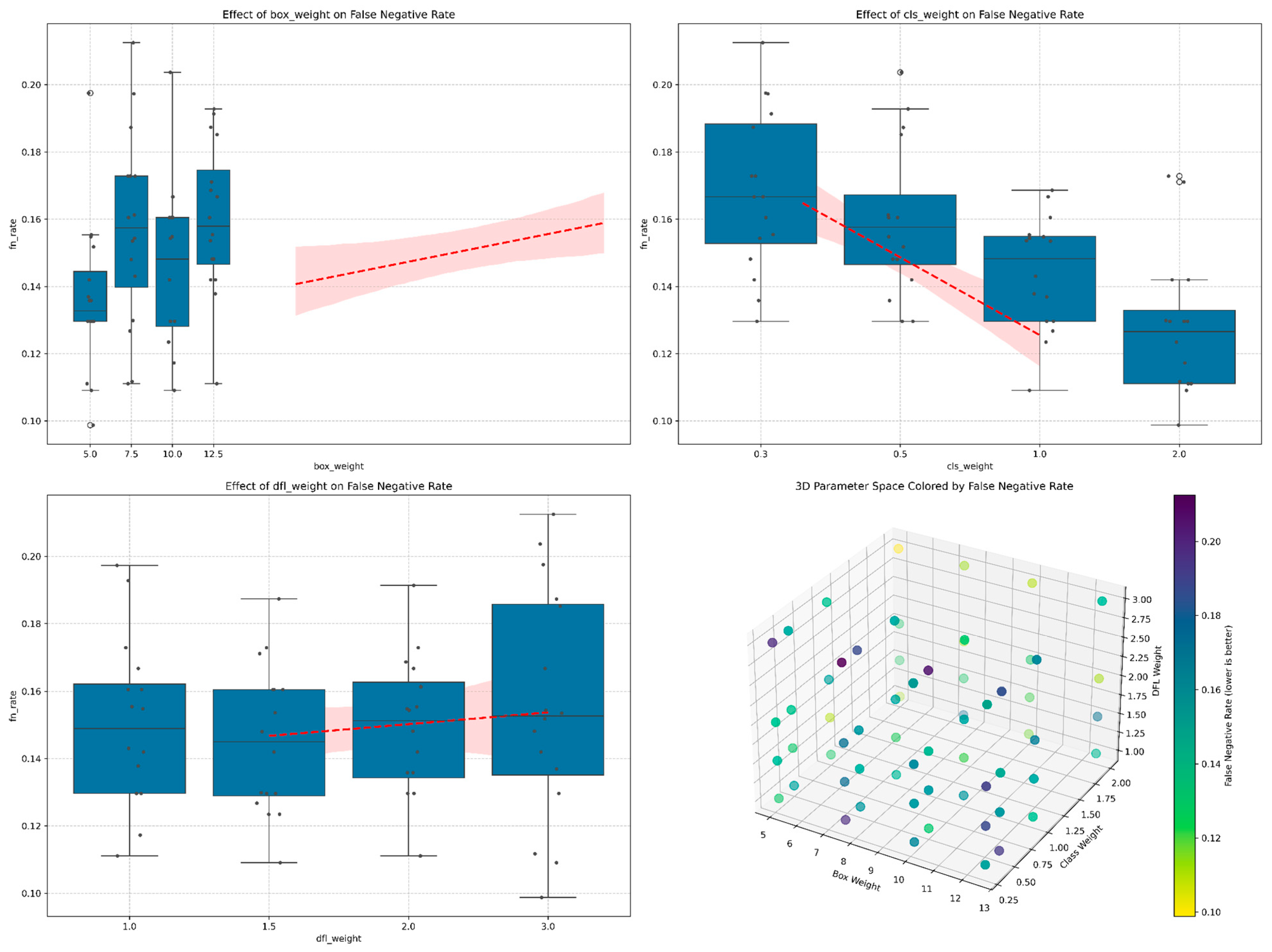 The dimensional relationship between hyperparameters and these metrics, as visualized in the 3D parameter space (Figure 4, bottom right), provides valuable guidance for practitioners. The consistent achievement of low false negative rates with high class weights (2.0) and low box weights (5.0) offers a clear direction for similar safety-critical detection applications.