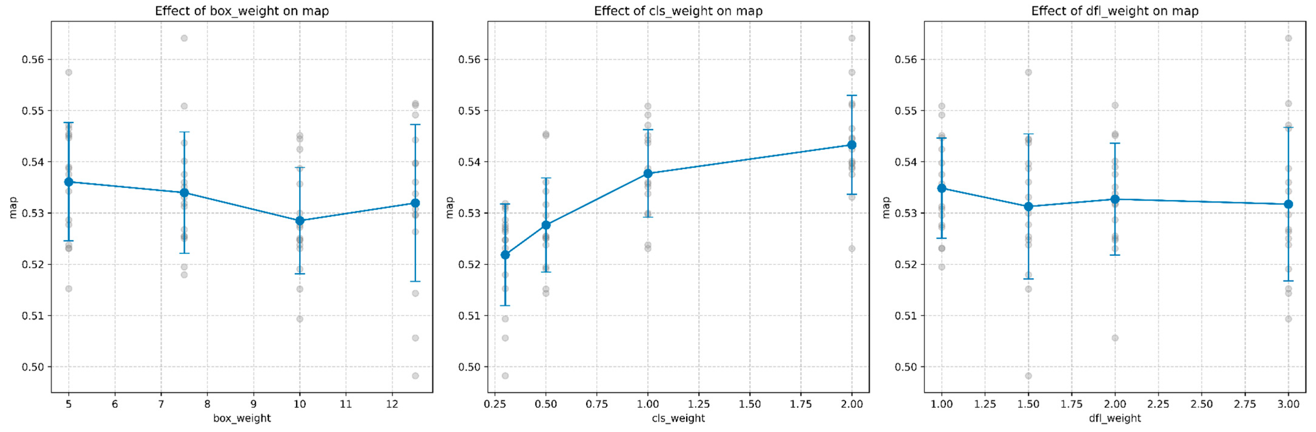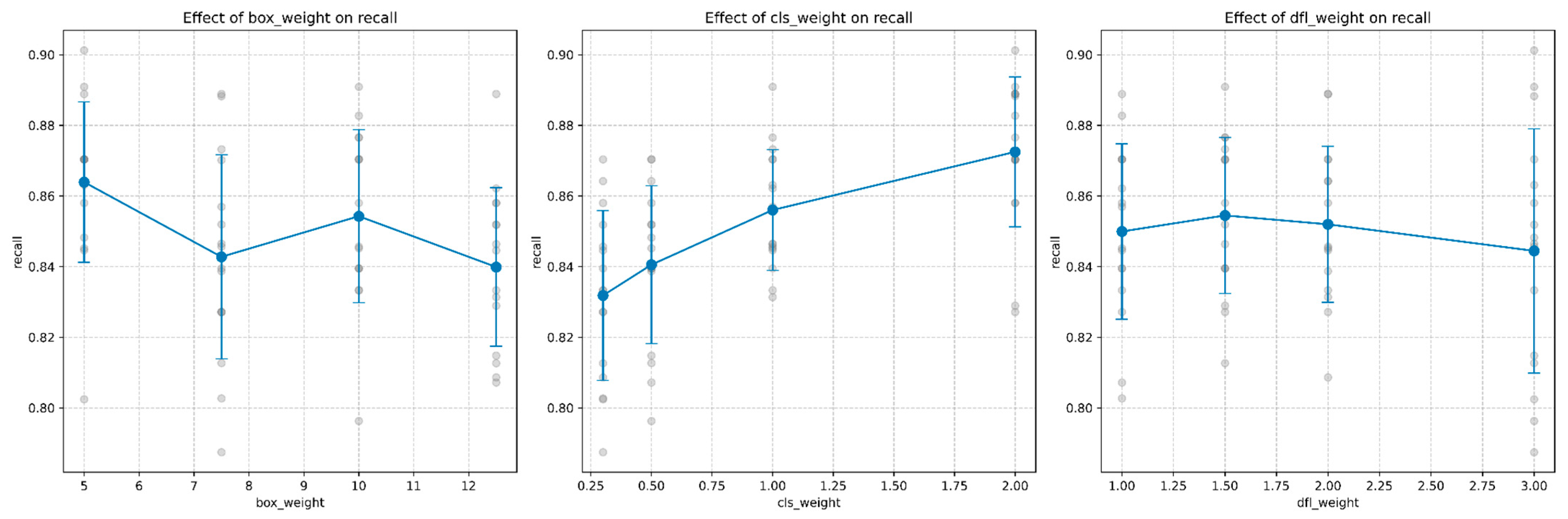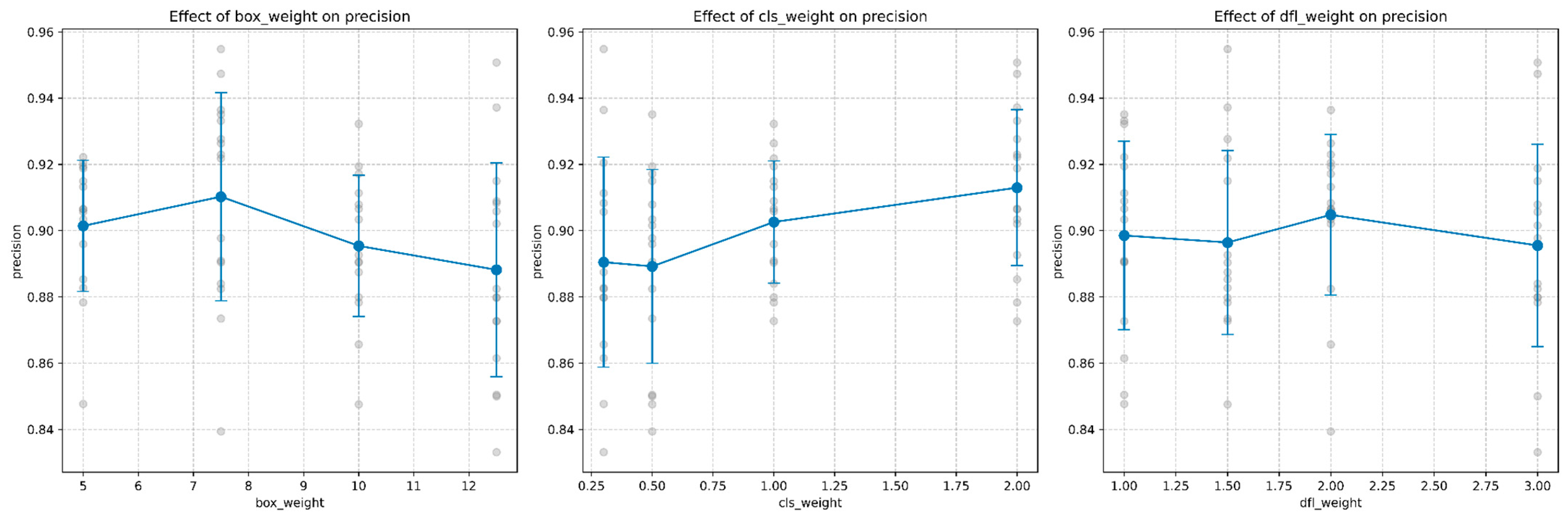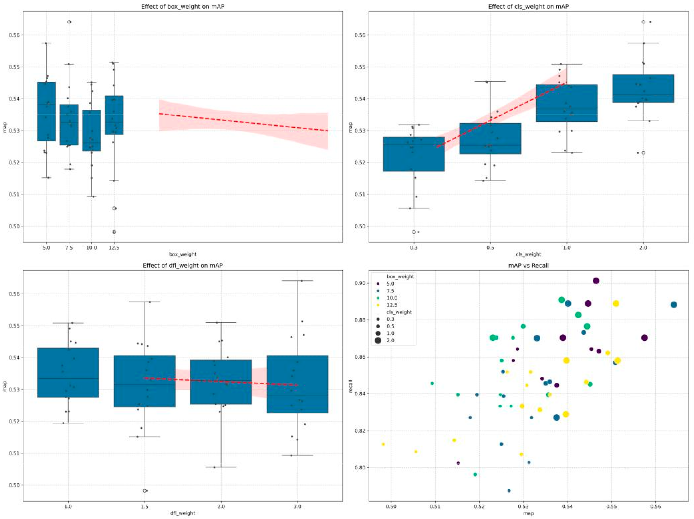 This resulted in a total of 64 distinct model configurations (4 box weight values × 4 class weight values × 4 DFL weight values) (Table 1).