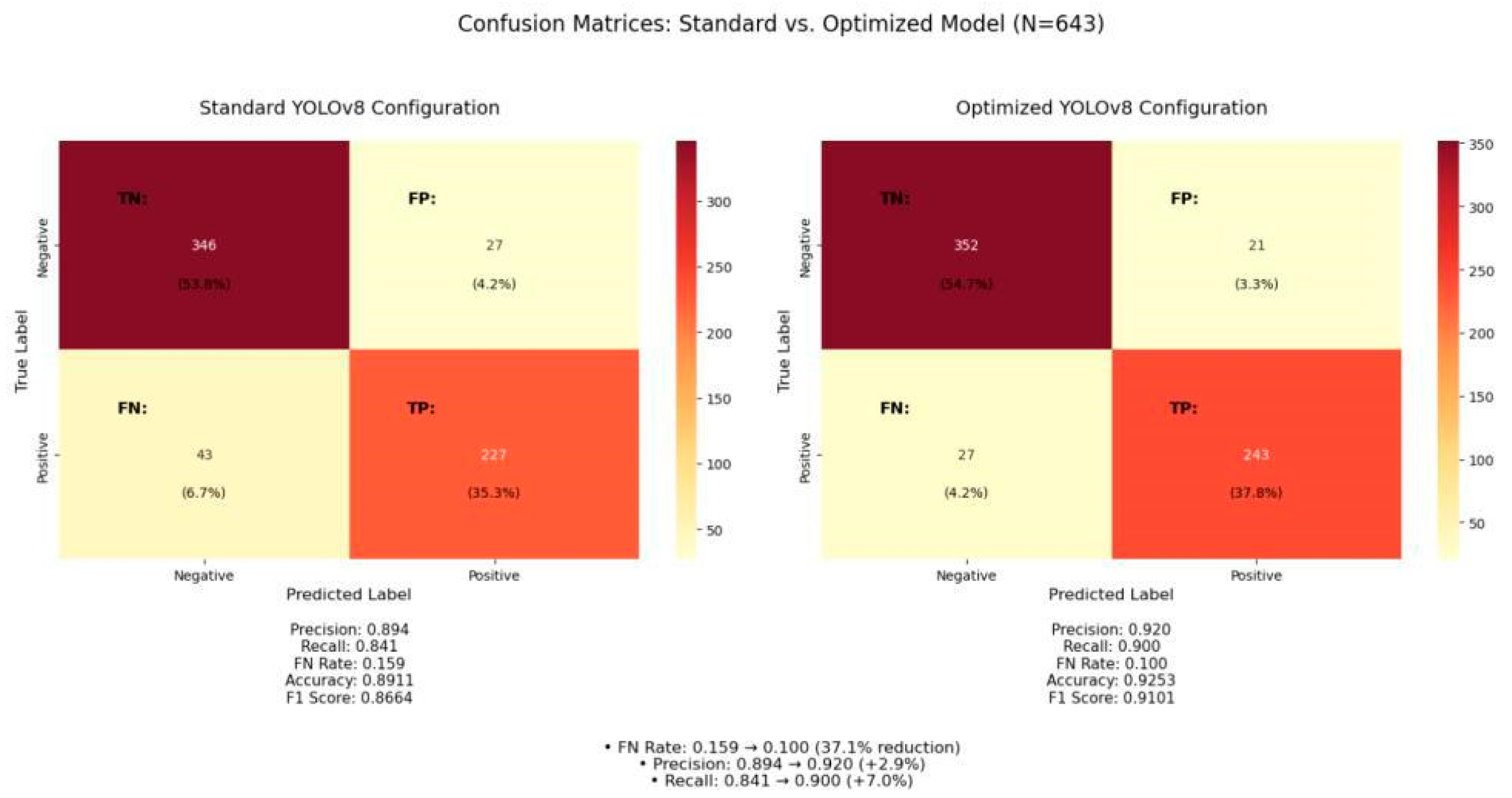 The confusion matrices for a representative test fold are visualized in Figure 11, providing a more detailed view of the classification outcomes. While these matrices represent a single test fold rather than the cross-validation average reported in Table 2, they clearly demonstrate the substantial reduction in false negatives (from 43 to 27) achieved by the optimized model, along with improvements in all other metrics. The slight variations between these specific values and the averages in Table 2 are expected due to fold-to-fold variance in the cross-validation process.