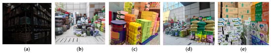 Figure 1. Weak-texture scenes in industrial environments. (a) Low brightness; (b) Uneven distribution of features; (c) Lack of texture; (d) Various shapes; (e) High texture similarity.