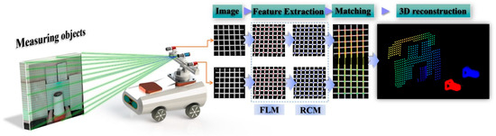 To address the challenges of feature extraction and 3D reconstruction in weak-texture scenes, where texture features are limited or unevenly distributed, a solution integrating laser marking and binocular vision is proposed. As shown in Figure 3, the system consists of a small laser projector and a binocular camera. The laser projector projects a marking pattern onto the environment (Figure 4), while the binocular camera captures the feature points. By leveraging the collimation and directionality of the laser, the system accurately extracts the sub-pixel center at the intersection of the horizontal and vertical light strips. To balance both efficiency and accuracy, the feature point extraction process is divided into two steps: first, morphological features and edge gradient constraints are used to quickly locate the feature points and determine their initial positions; second, sub-pixel precision is achieved by considering the distribution characteristics of the light strips. Finally, a sparse point cloud is generated for environmental modeling through epipolar constraint matching and parallax re-construction.