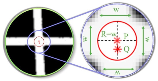 Given the redundancy caused by repeated feature points at the feature points shown in Figure 5 (W refers to the fringe width, R denotes the search radius, and the red asterisk-marked points P and Q represent the positions of feature points extracted by FLM), the f ( x , y ) discriminant based on the acquisition of feature point distribution information is introduced, and a redundant removal model is proposed to obtain the final feature point P ( x , y ) , as shown below.