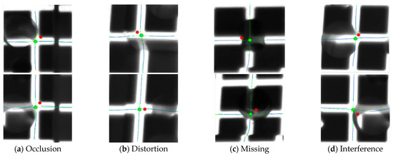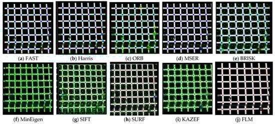 To verify the effectiveness of the proposed FLM, it is compared with traditional corner point extraction algorithms, such as SURF and Harris, on the same image set. As shown in Figure 6, invalid points are marked in green, missed points in blue, and successfully extracted points in red.
