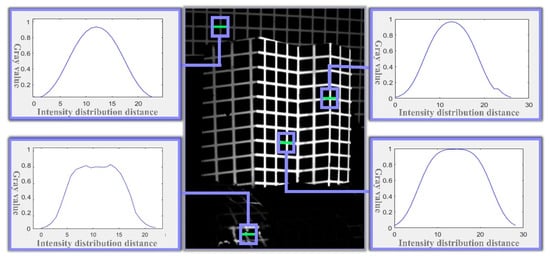 To ensure the accuracy and robustness of the feature point extraction process, the proposed method analyzes the grayscale distribution of the laser stripe based on the principle of laser luminescence. As illustrated in Figure 8, the grayscale distribution remains stable under various conditions, including overexposed mirror reflections, foreground highlights, and dark background regions. Specifically, the distribution follows a Gaussian profile, is uniformly extended along the length of the stripe, and peaks at the center. The center points of the stripe’s cross-section accurately represent its central axis.