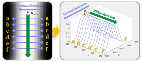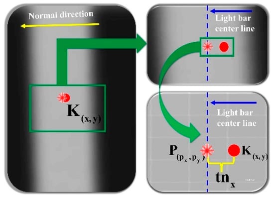 In the equation, (x, y) represents point K’s initial coordinates, n = ( n x , n y ) is represented by the eigenvector corresponding to the maximum eigenvalue of the Hessian matrix, that is, the normal direction of the light strip, t is the sub-pixel offset calculated through: