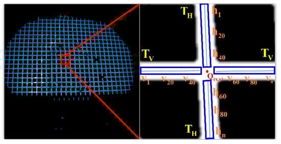 As an example, Steger extracts the center of the horizontal and vertical light strip section at Q ( X O , Y O ) to form a longitudinal point set T H and a transverse point set T V .