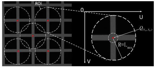 Based on the initial position of the feature points, to deal with the loss or deformation of some sections that may be caused by local light strip occlusion and distortion, a circular area of interest with a grid width of L max is defined as the radius. L max , as shown in Figure 12 (ROI refers to the Region of Interest in the RCM algorithm, and R denotes the radius of the ROI.) to obtain the feature points. Set the center points of the horizontal and vertical light strips in the area of interest to reduce randomness and enhance the accuracy and robustness of the fitting. As shown in Figure 11, taking the initial feature point.