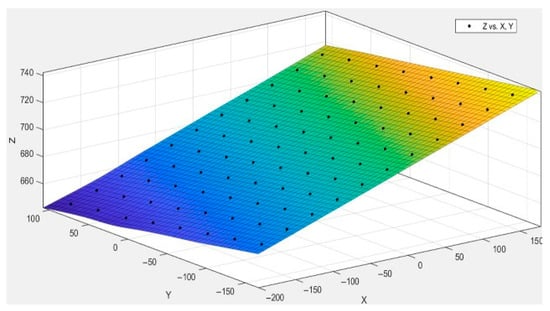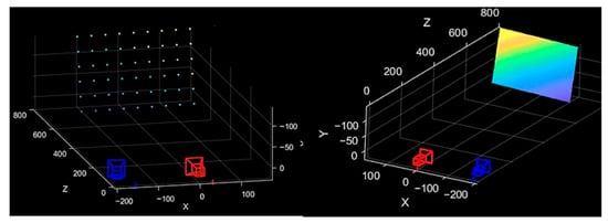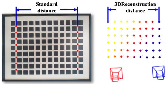 The 3D plane fitting was performed based on the reconstructed 3D coordinates of the feature points, with the fitting result shown in Figure 17. The black points in the figure represent the 3D coordinates of the feature points, all of which are essentially located on the same plane. The residual sum of squares (SSE) of the fitted 3D plane is 1.925 × 10 24 , and the coefficient of determination is 1, indicating that the 3D reconstruction of the feature points has a high degree of planarity. This result is consistent with the actual condition of the standard measurement plate, further validating the superiority of the overall reconstruction performance. To further evaluate the reconstruction accuracy, we compared the actual distances of the first and last columns of the standard plate with the 3D reconstruction results. The error information is shown in Figure 18.